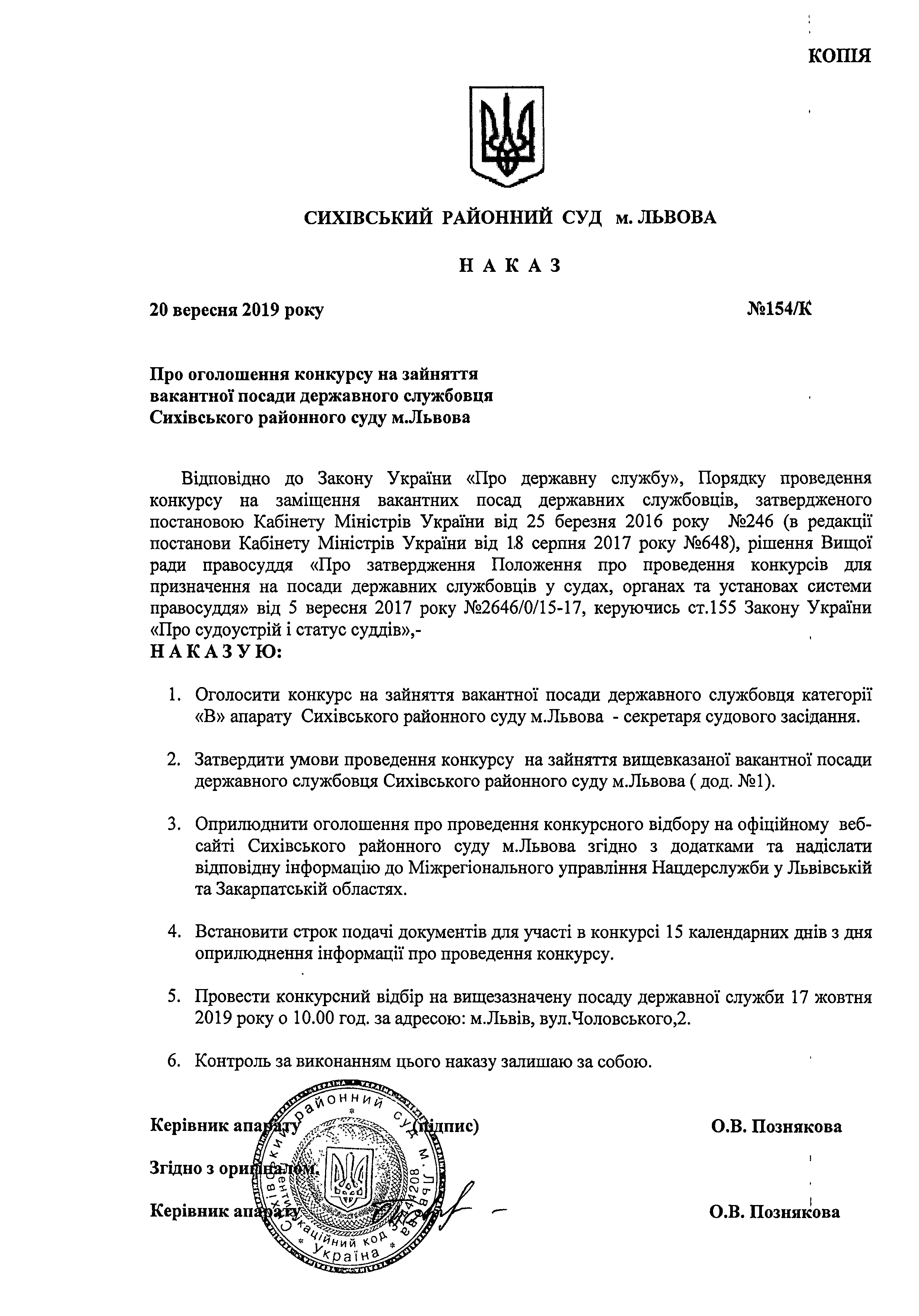 Умови проведення конкурсу на зайняття вакантної посади державної служби категорії «в» - секретаря судового засідання.