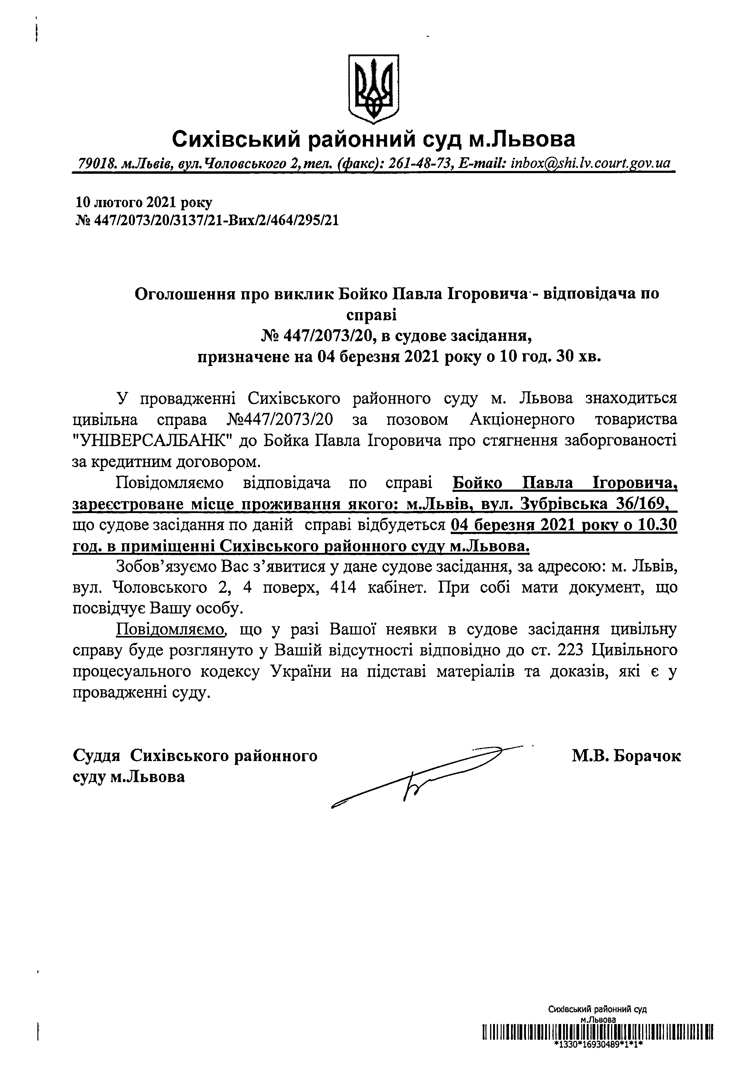 Оголошення про виклик Бойко П.І. в судове засідання по справі №447/2073/20, призначене на 10:30год. 04.03.2021р.