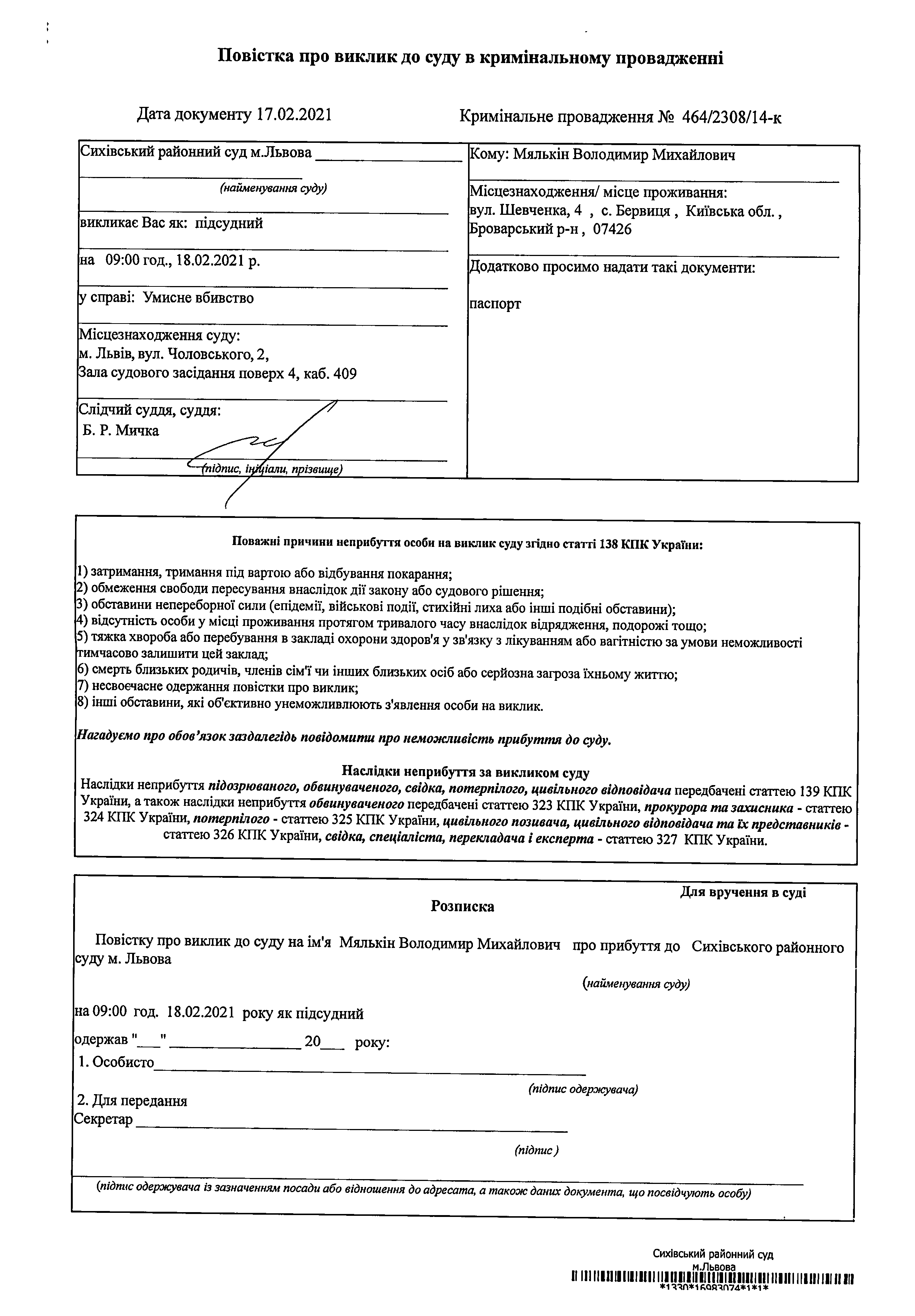 Повістка про виклик Мялькіна В.М. в судове засідання по справі №464/2308/14-к на 09:00год. 18.02.2021р.