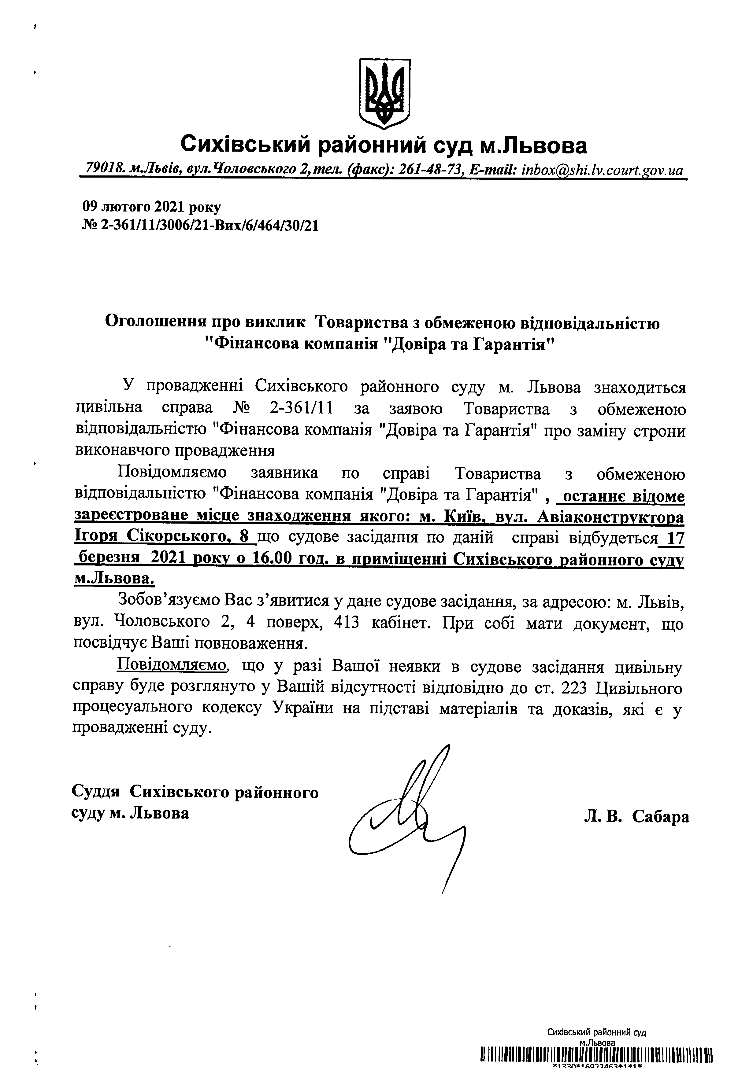 Оголошення про виклик ТзОВ ФК "Довіра та Гарантія" в судове засідання по справі №2-361/11, призначене на 16:00год. 17.03.2021р.