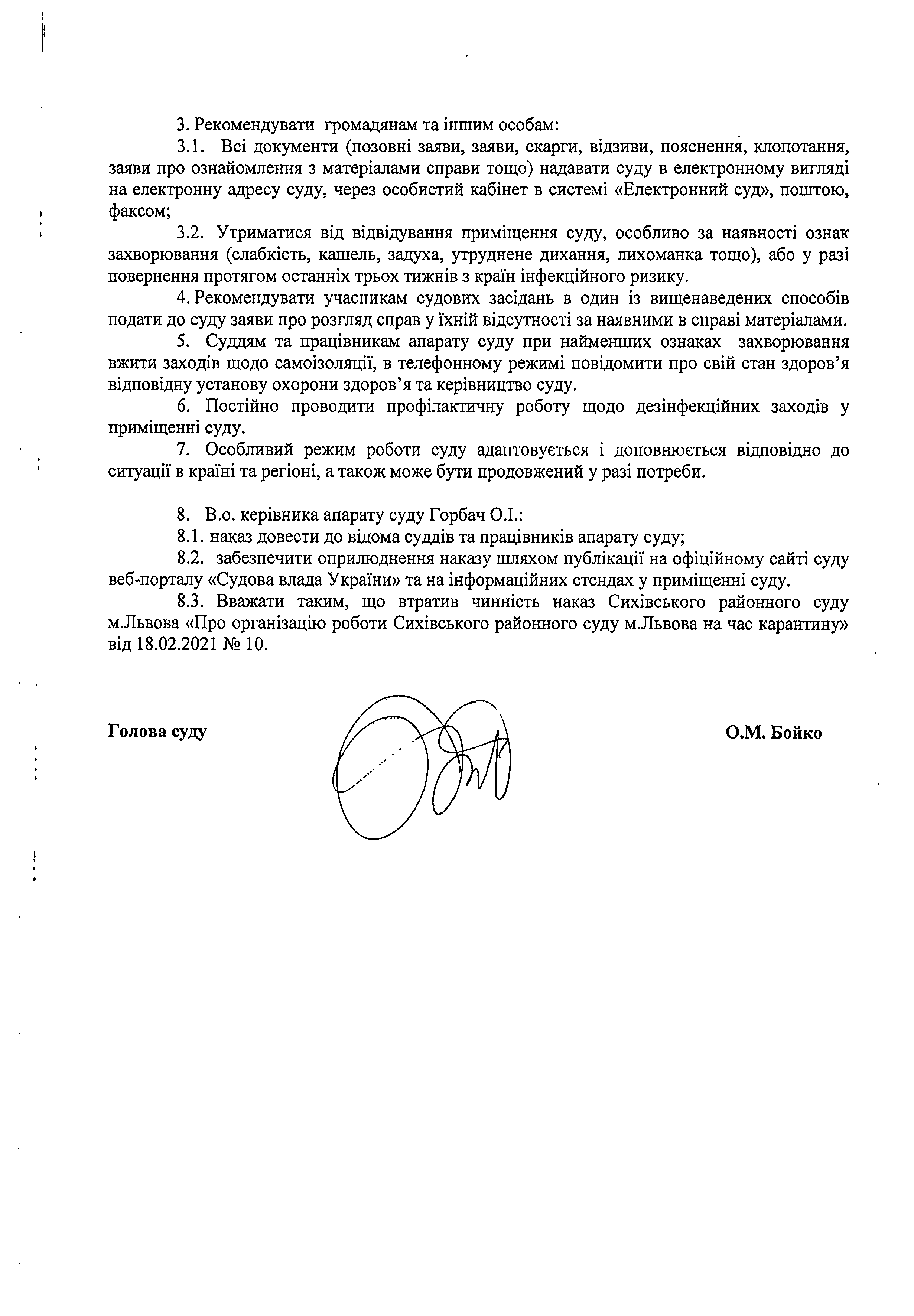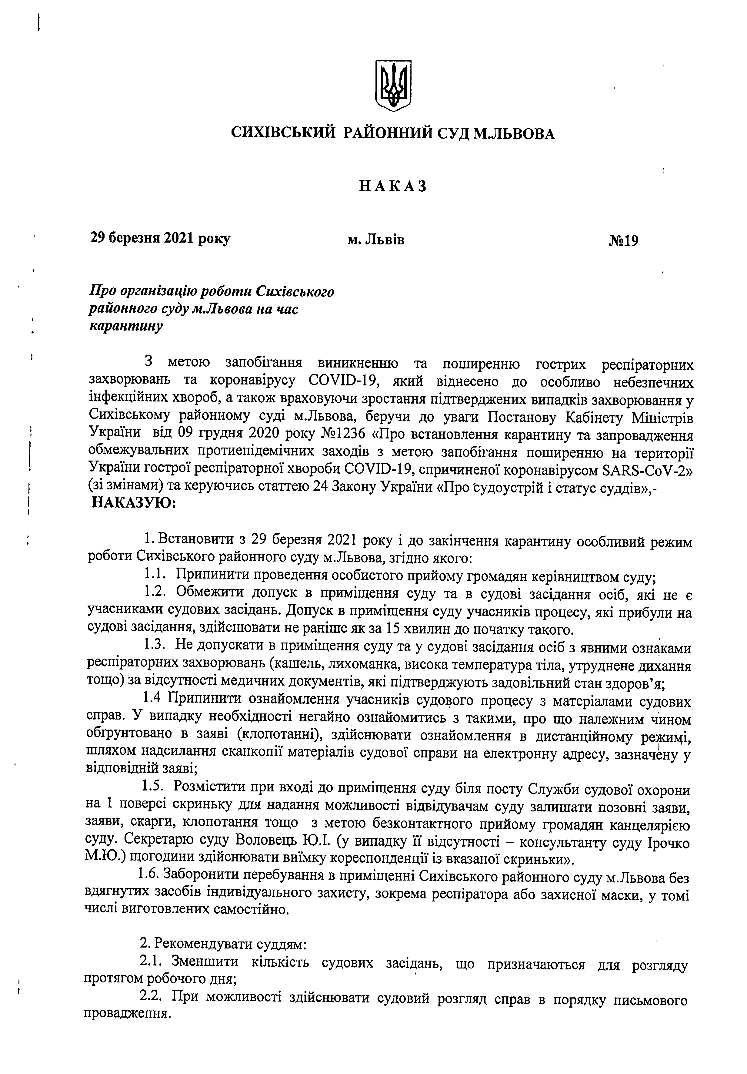 Про організацію роботи Сихівського районного суду м.Львова на час карантину