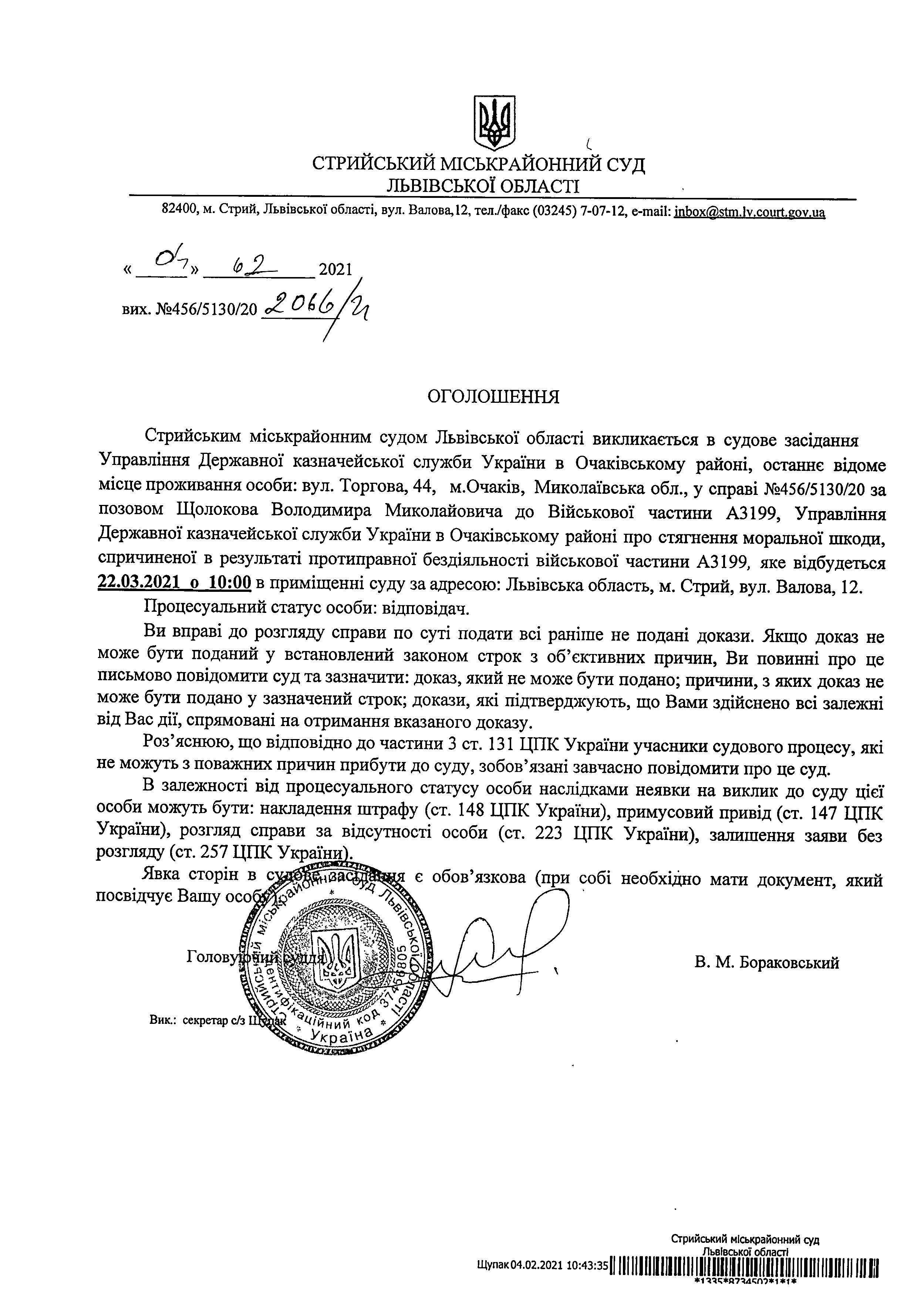 Про виклик Управління Державної казначейської служби України в Очаківському районі