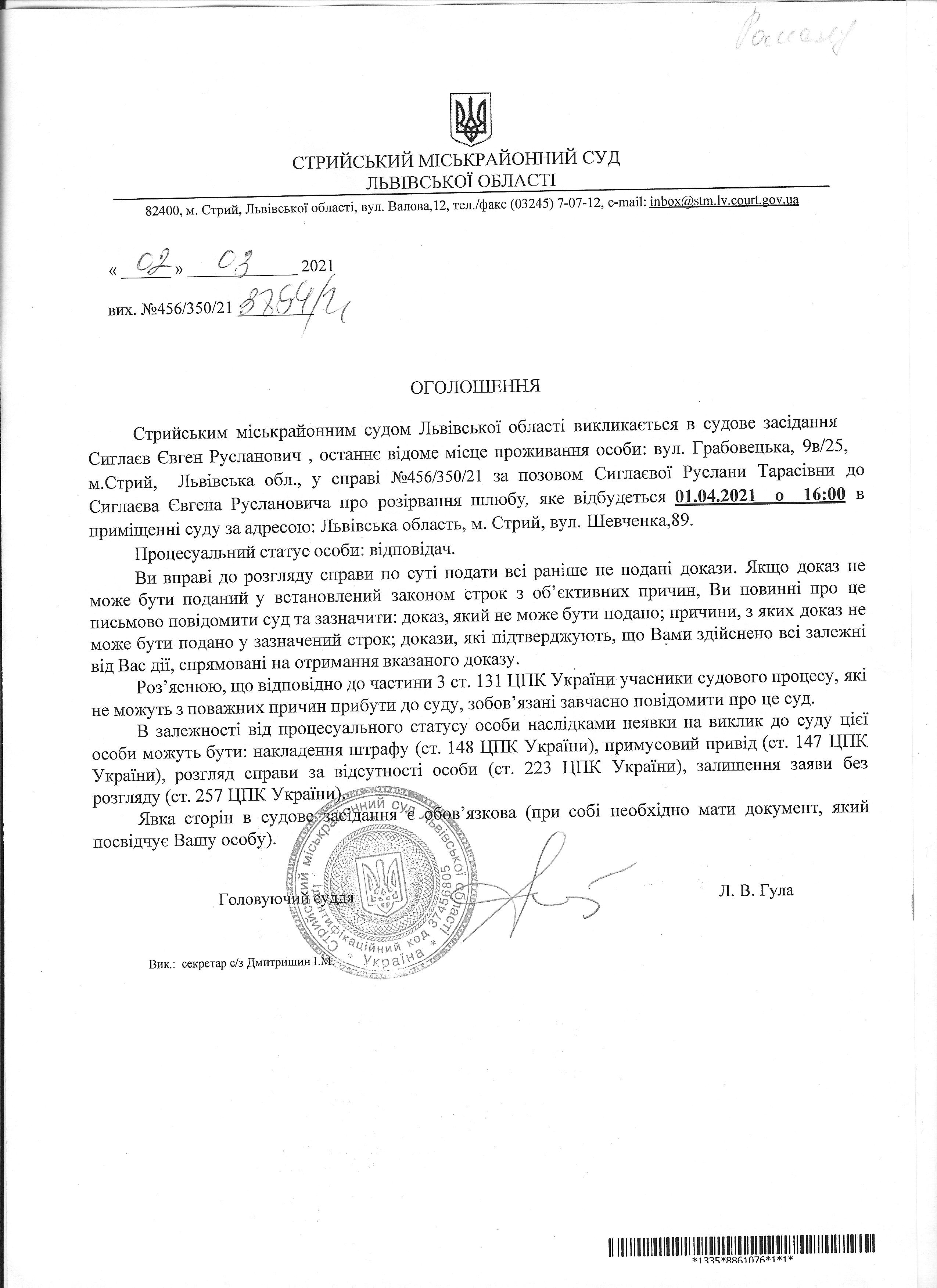 Про виклик Сиглаєв Є.Р.