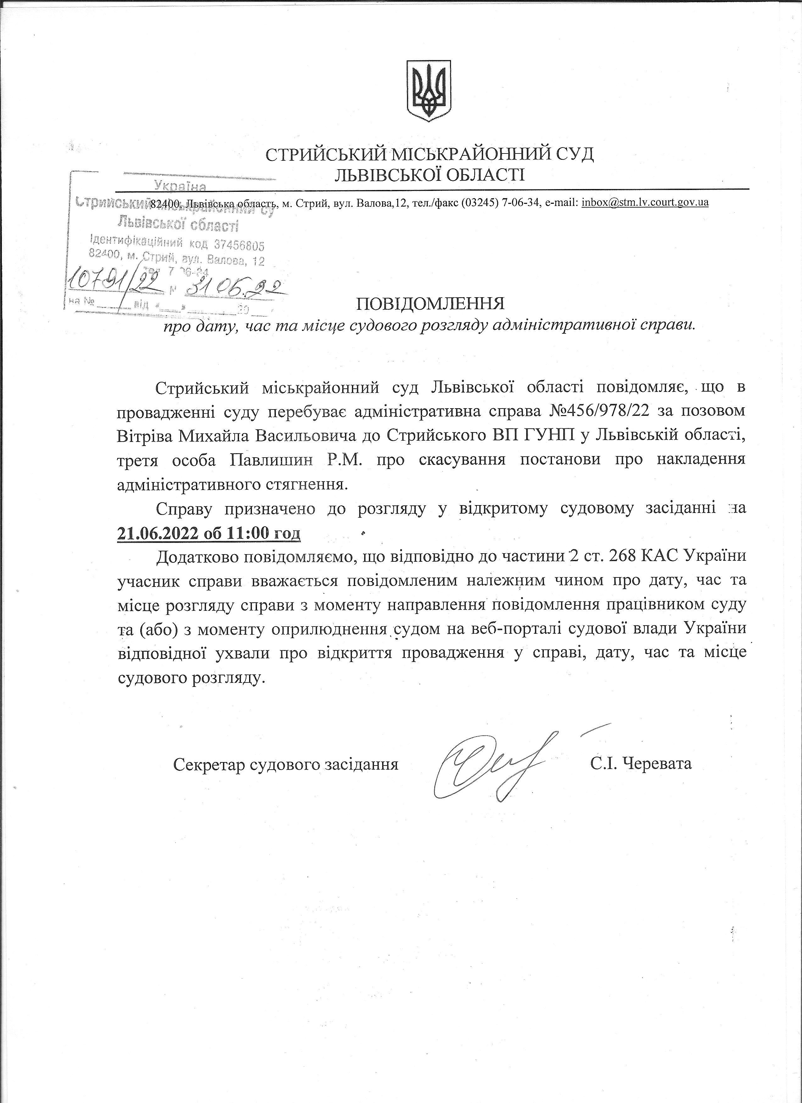 Повідомлення про дату, час та місце судового розгляду адміністративної справи
