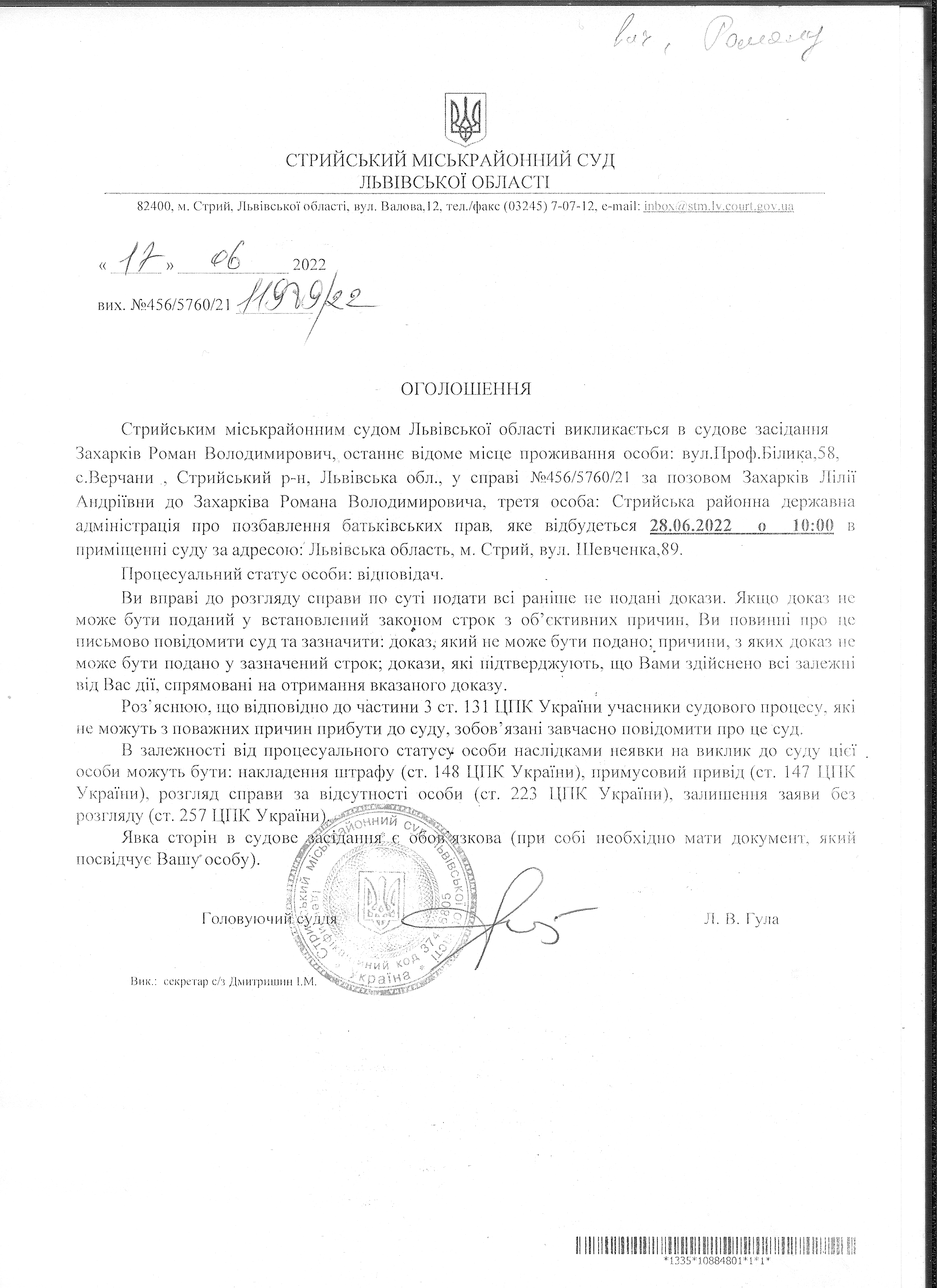 Про виклик Захарків Р.В.
