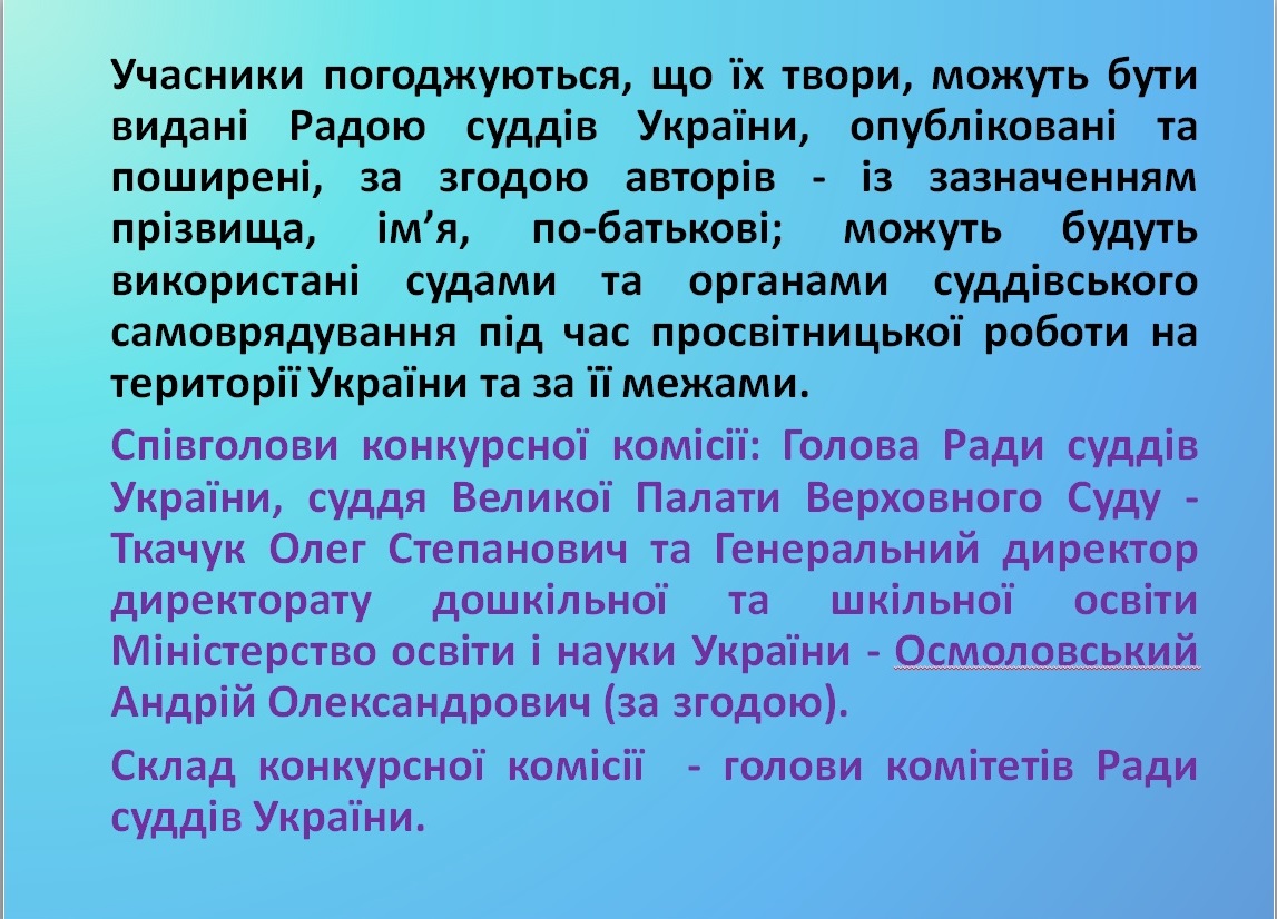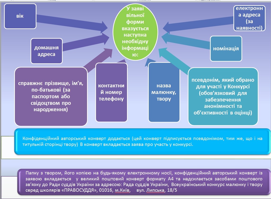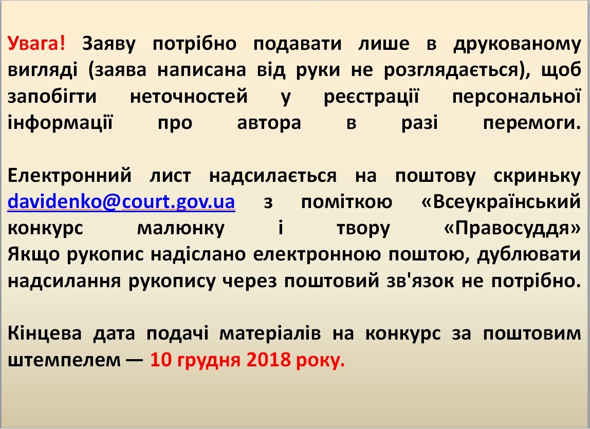 Вимоги до малюнків: головні персонажі – суддя, суд, працівник суду, бачення дитиною ролі судді, права, закону і призначення судочинства і правосуддя в Україні.