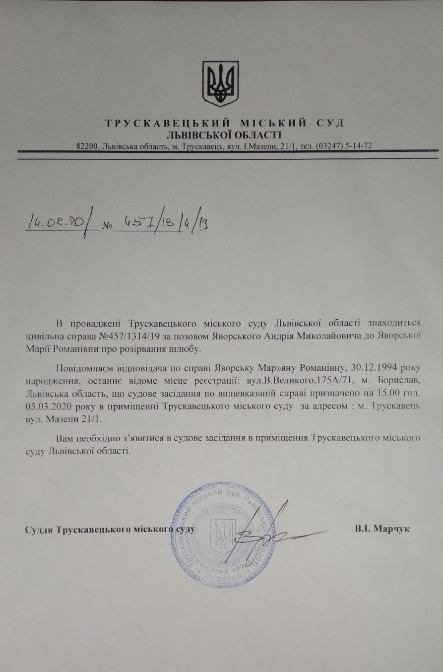 Оголошення про виклик Яворської Мар’яни Романівни відповача по справі № 457/1314/19 в судове засідання на 15:00 год. 05 Березня 2020 року