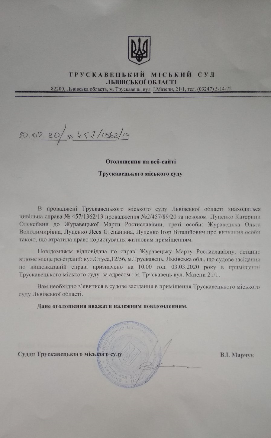 Оголошення про виклик Журавецьку Марту Ростиславівну відповача по справі № 457/89/20 в судове засідання на 10:00 год. 03 Березня 2020 року