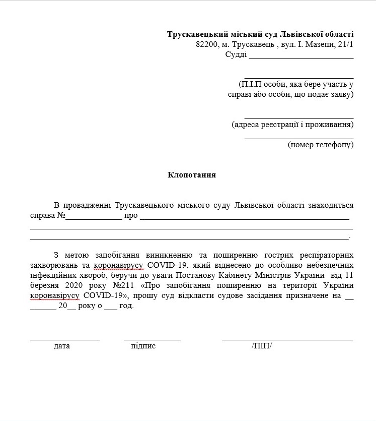 Зразок заяви про відкладення судового засідання у зв'язку із поширення