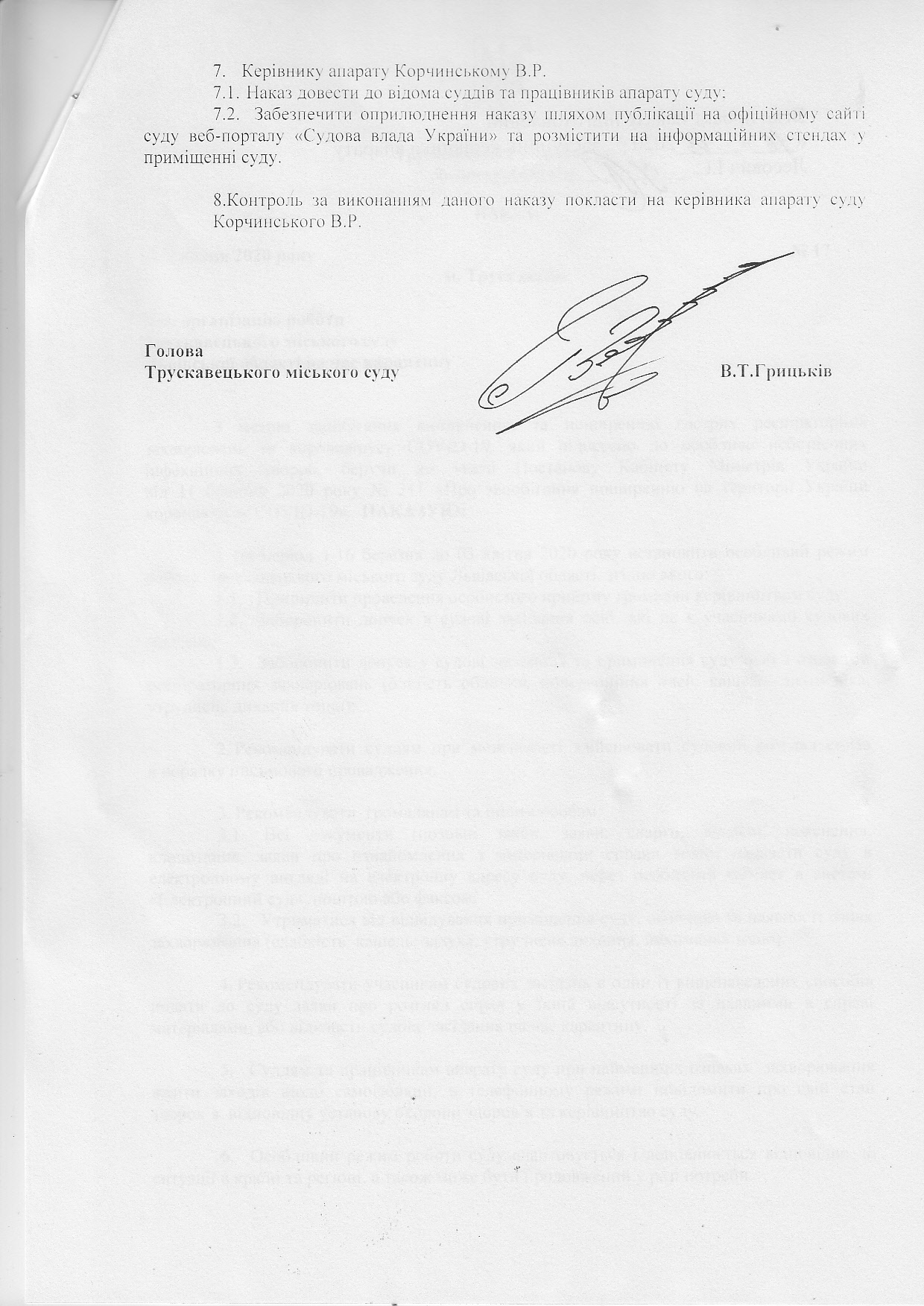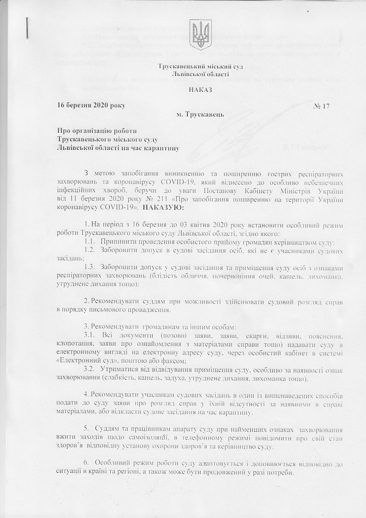 У зв’язку зі спалахом у світі вірусу COVID-2019, просимо громадян, які є учасниками судових процесів, утриматися від участі у судових засіданнях, якщо слухання не передбачають обов'язкової присутності учасників сторін, а також утриматися від відвідин суду, якщо у вас є ознаки будь-якого вірусного захворювання.