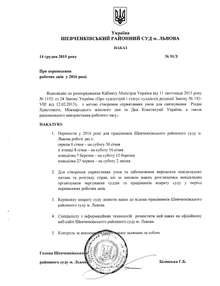 Про перенесення робочих днів в січні 2016 р.