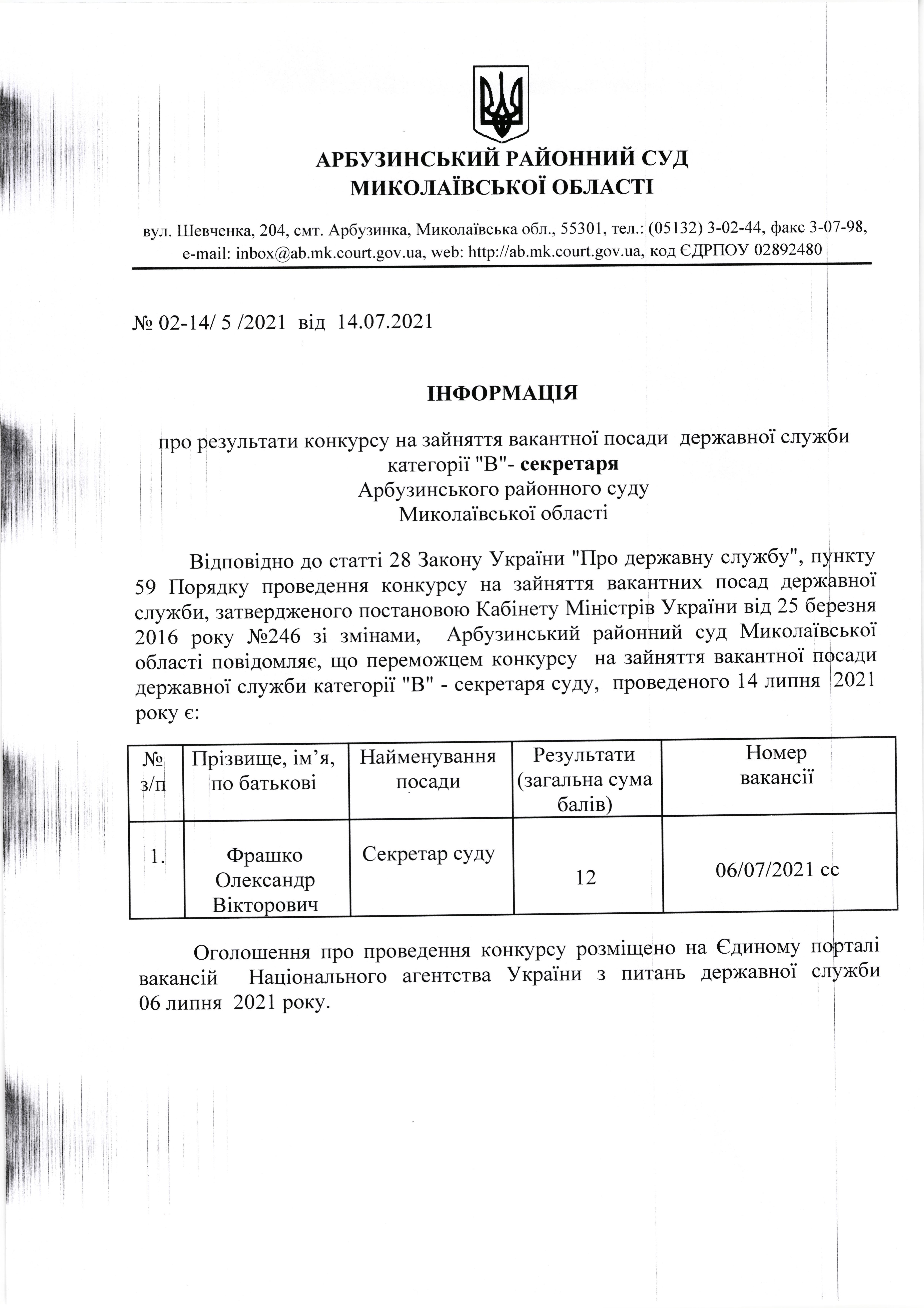 Інформація про результати конкурсу на зайняття вакантної посади державної служби категорії «В» - секретаря Арбузинського районного суду Миколаївської області