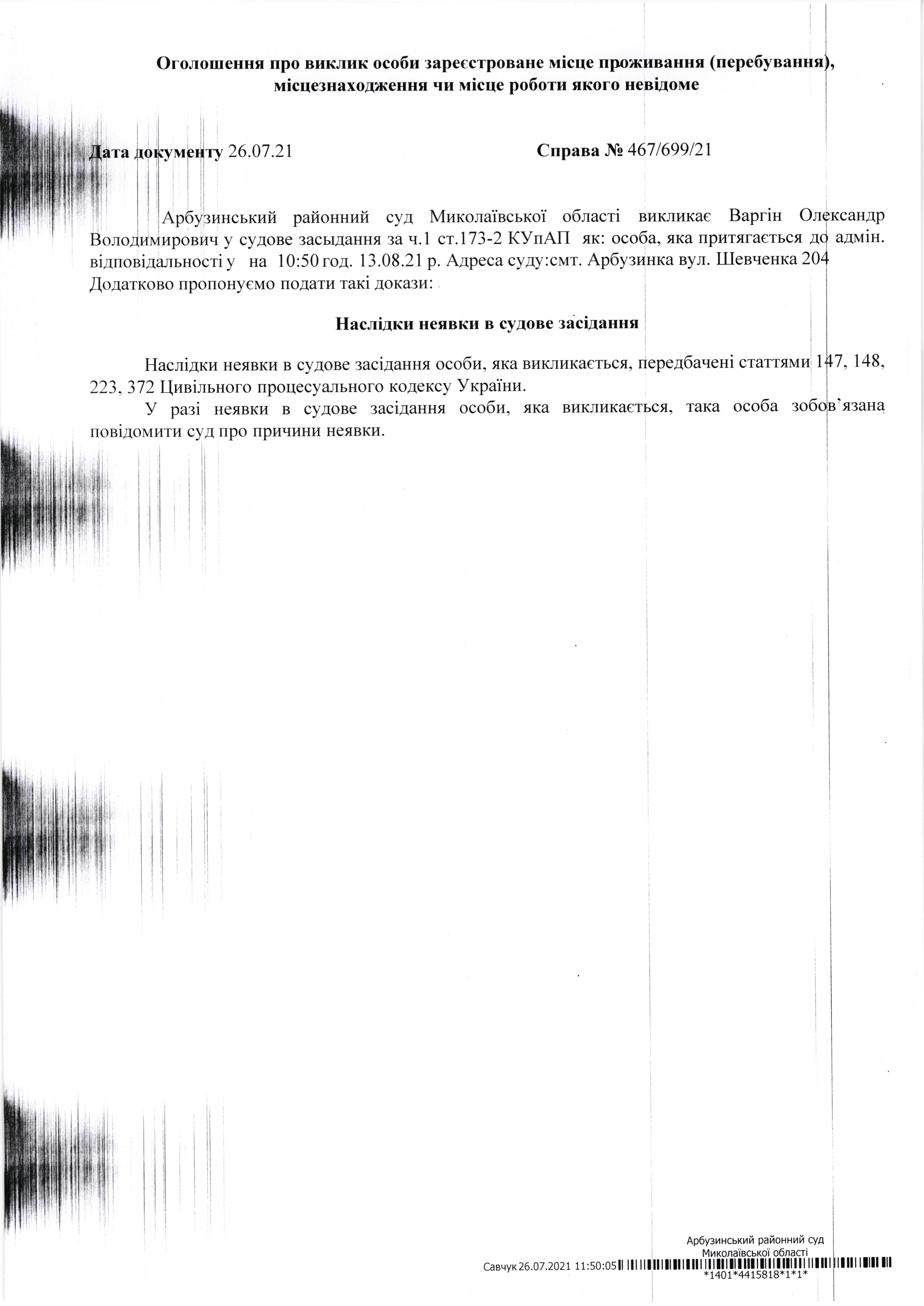 Оголошення про виклик до суду Варгін Олександр Володимирович