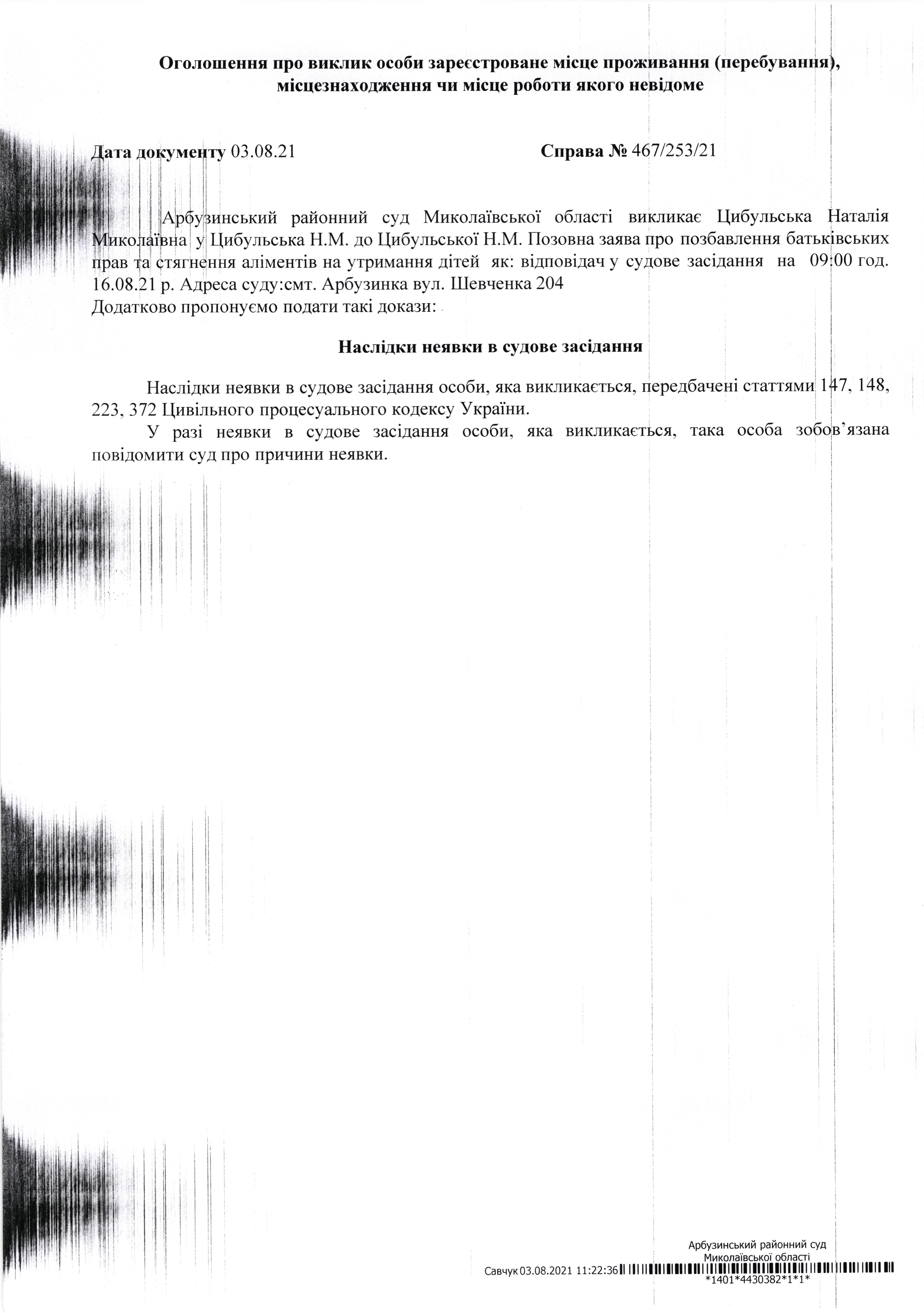 Оголошення про виклик до суду Цибульська Наталія Миколаївна