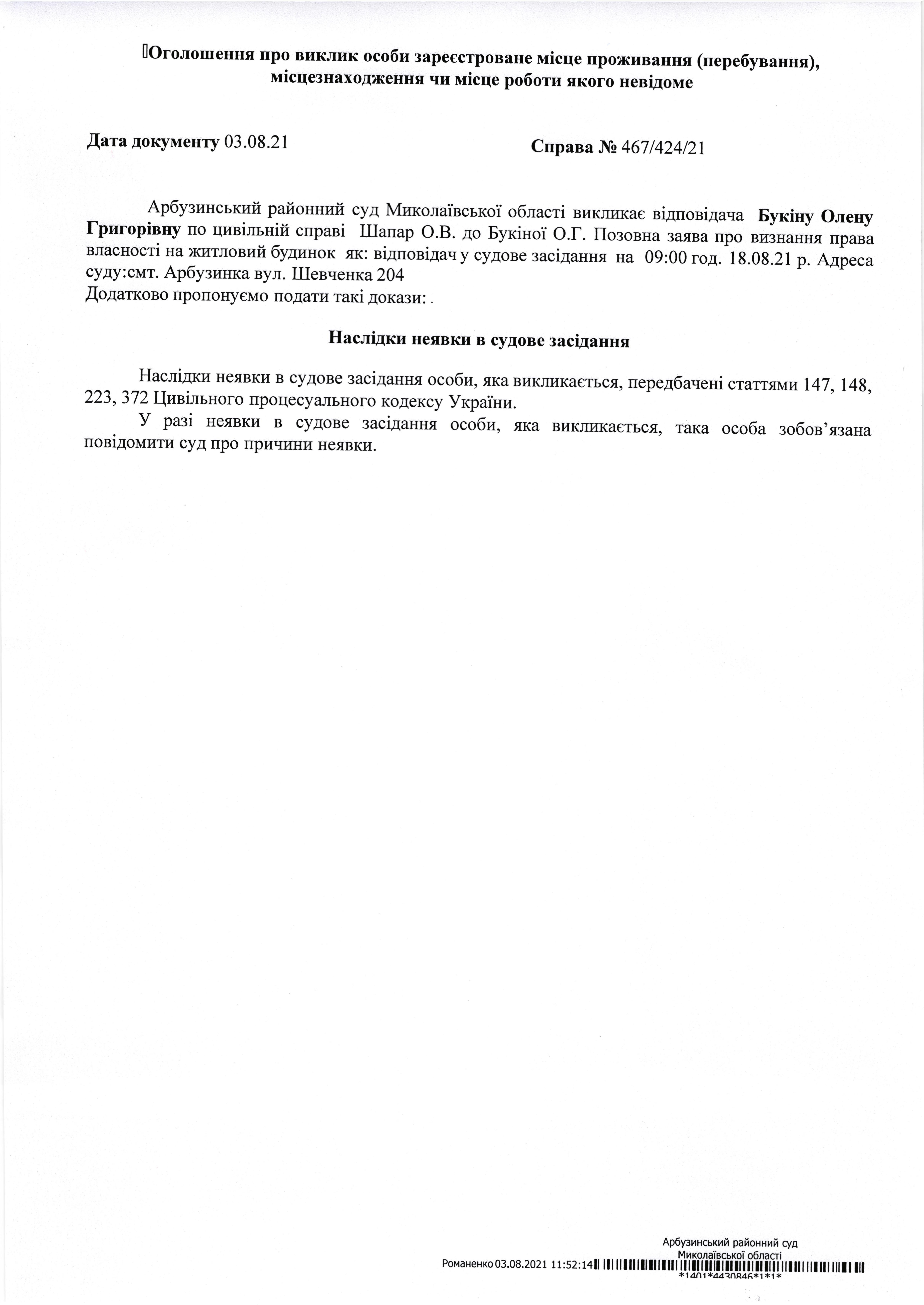 Оголошення про виклик до суду Букіна Олена Григорівна