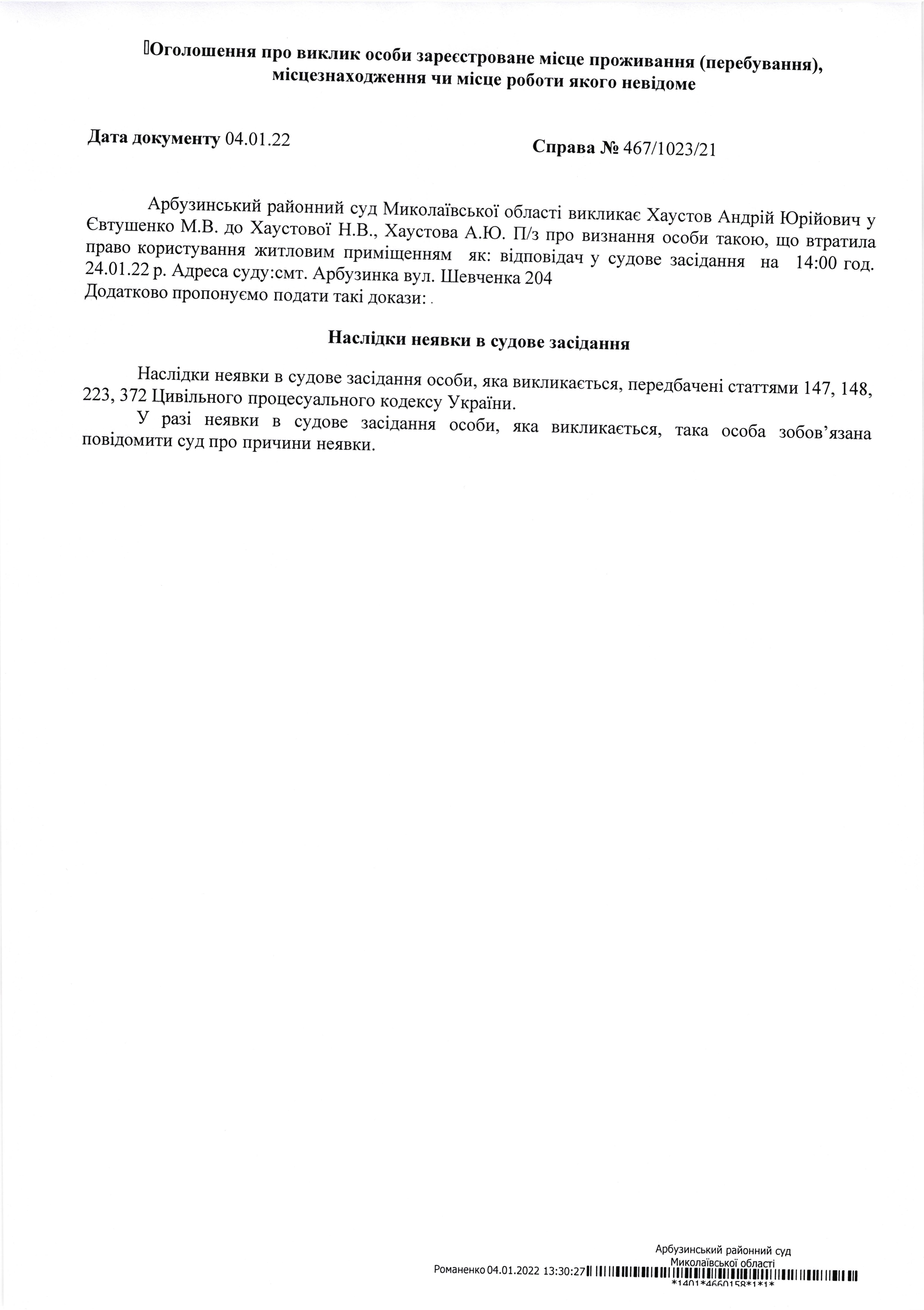 Оголошення про виклик до суду Хаустов Андрій Юрійович
