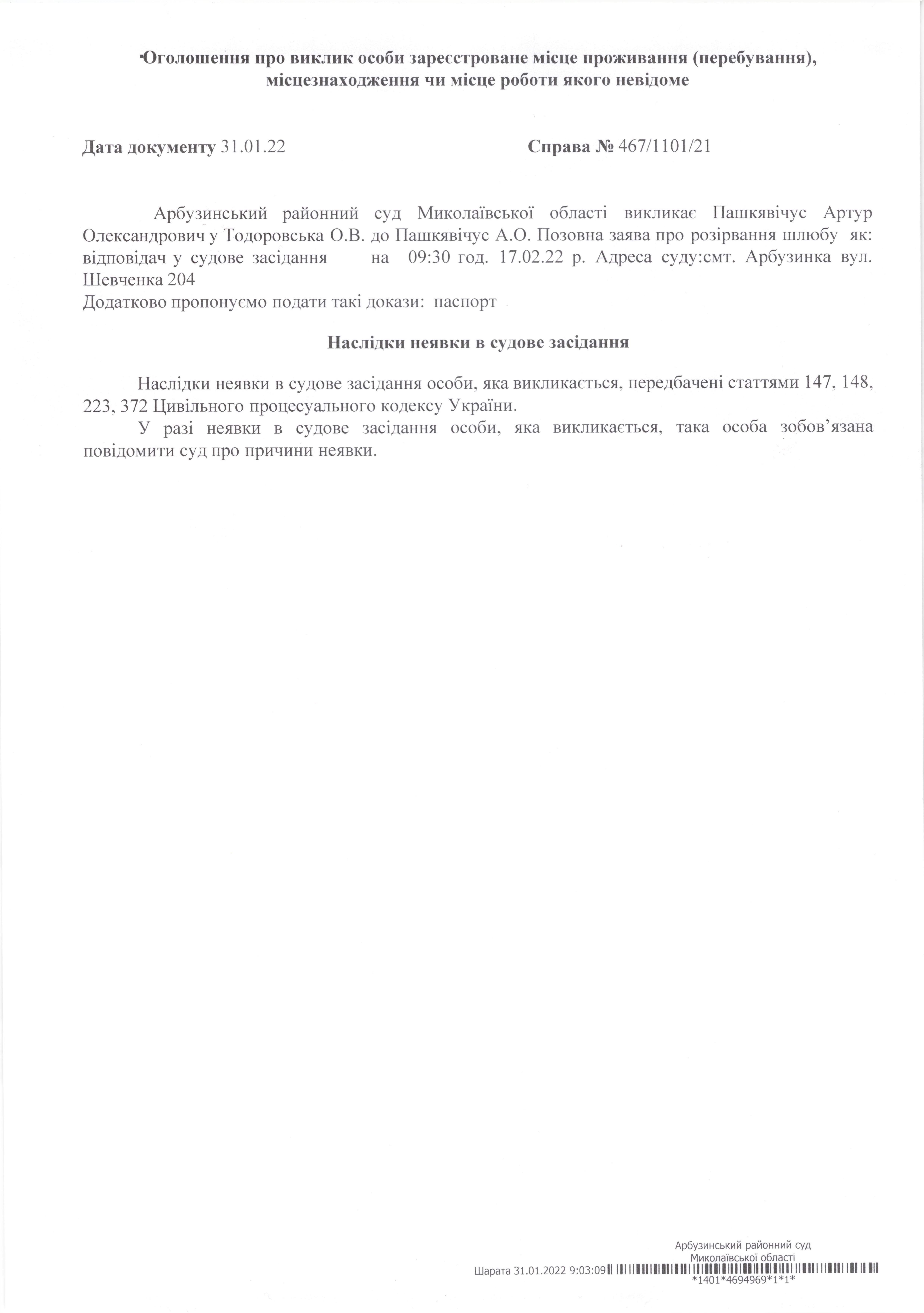 Оголошення про виклик до суду Пашкявічус Артур Олександрович