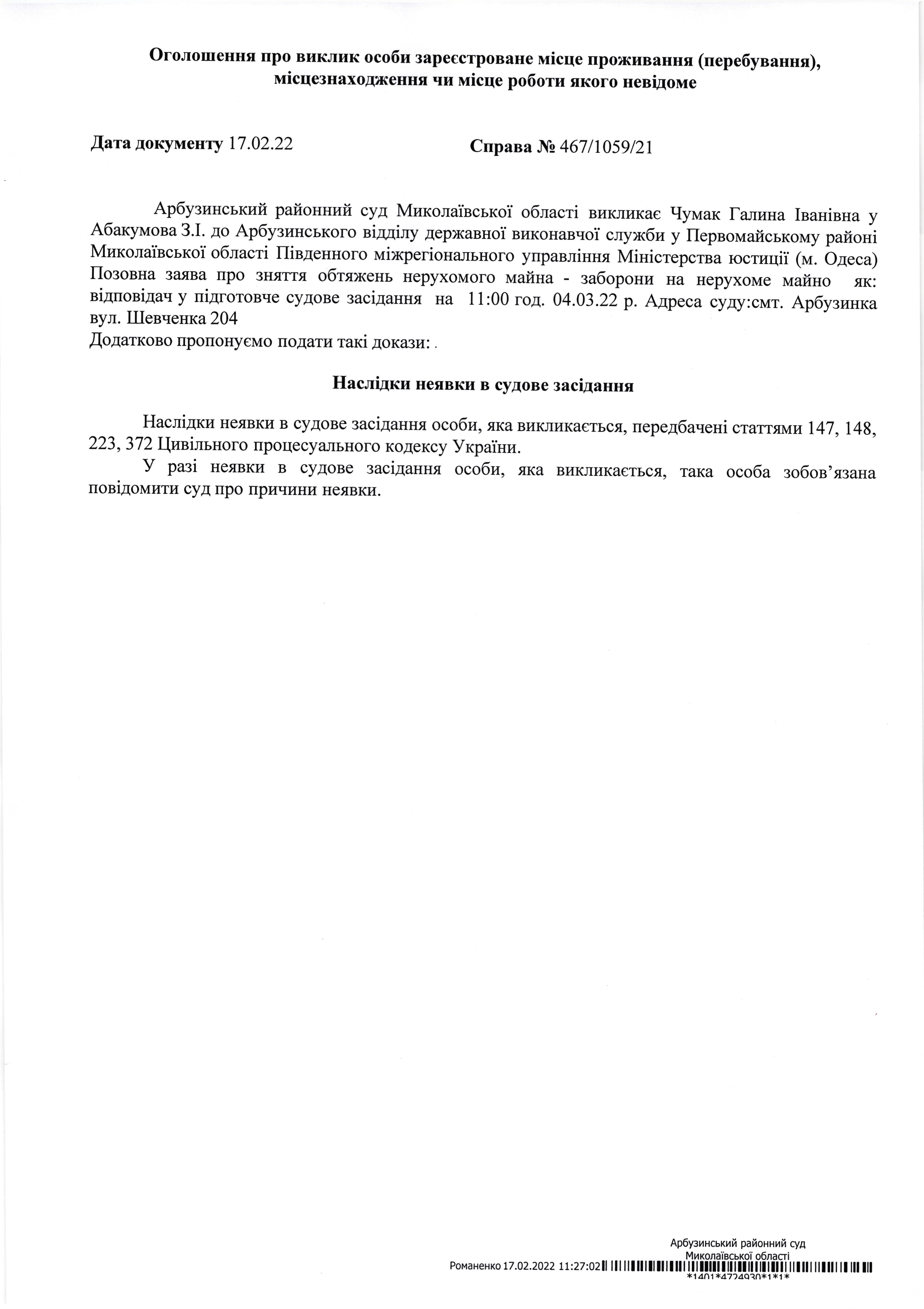 Оголошення про виклик до суду Чумак Галина Іванівна