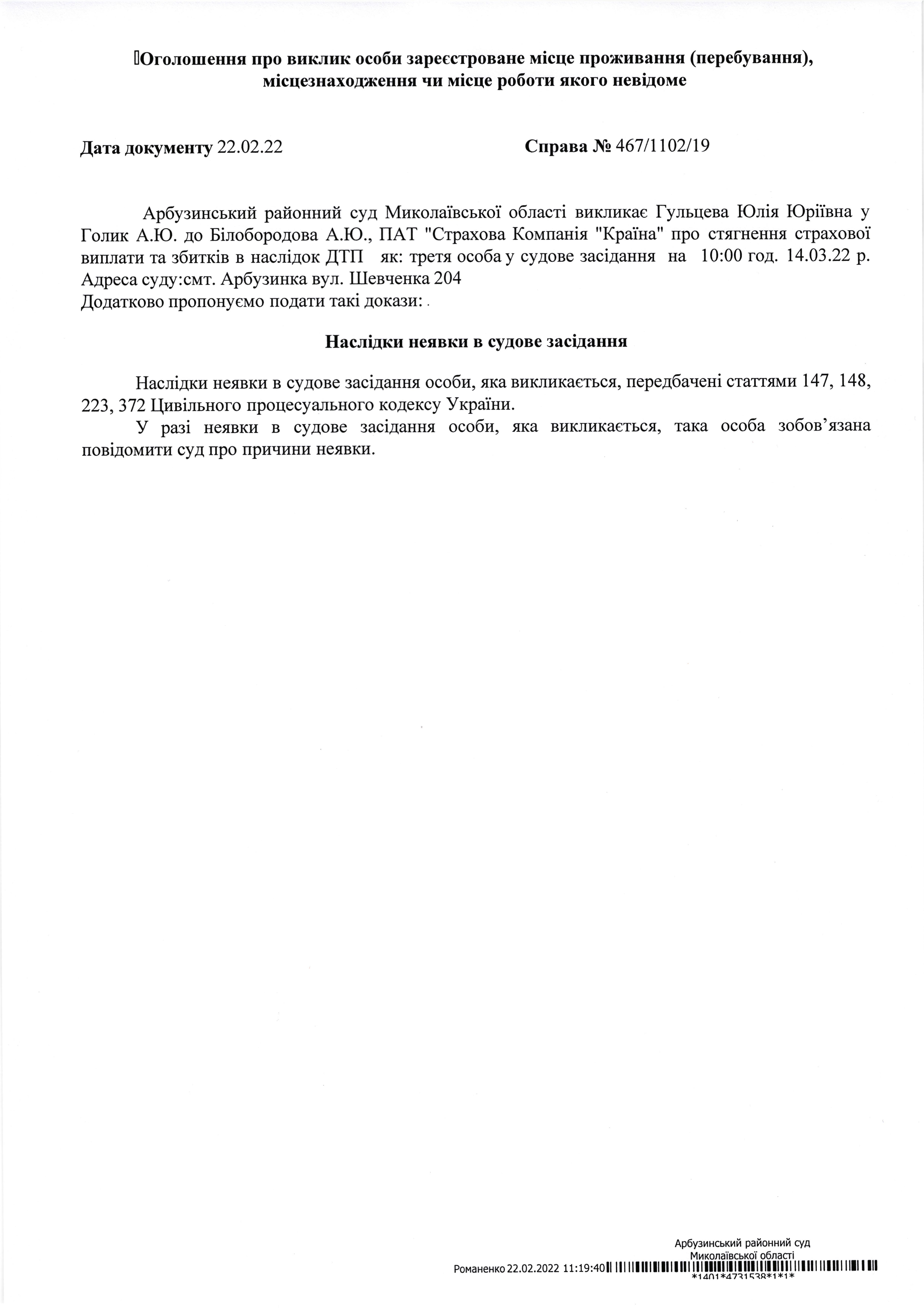 Оголошення про виклик до суду Гульцева Юлія Юріївна