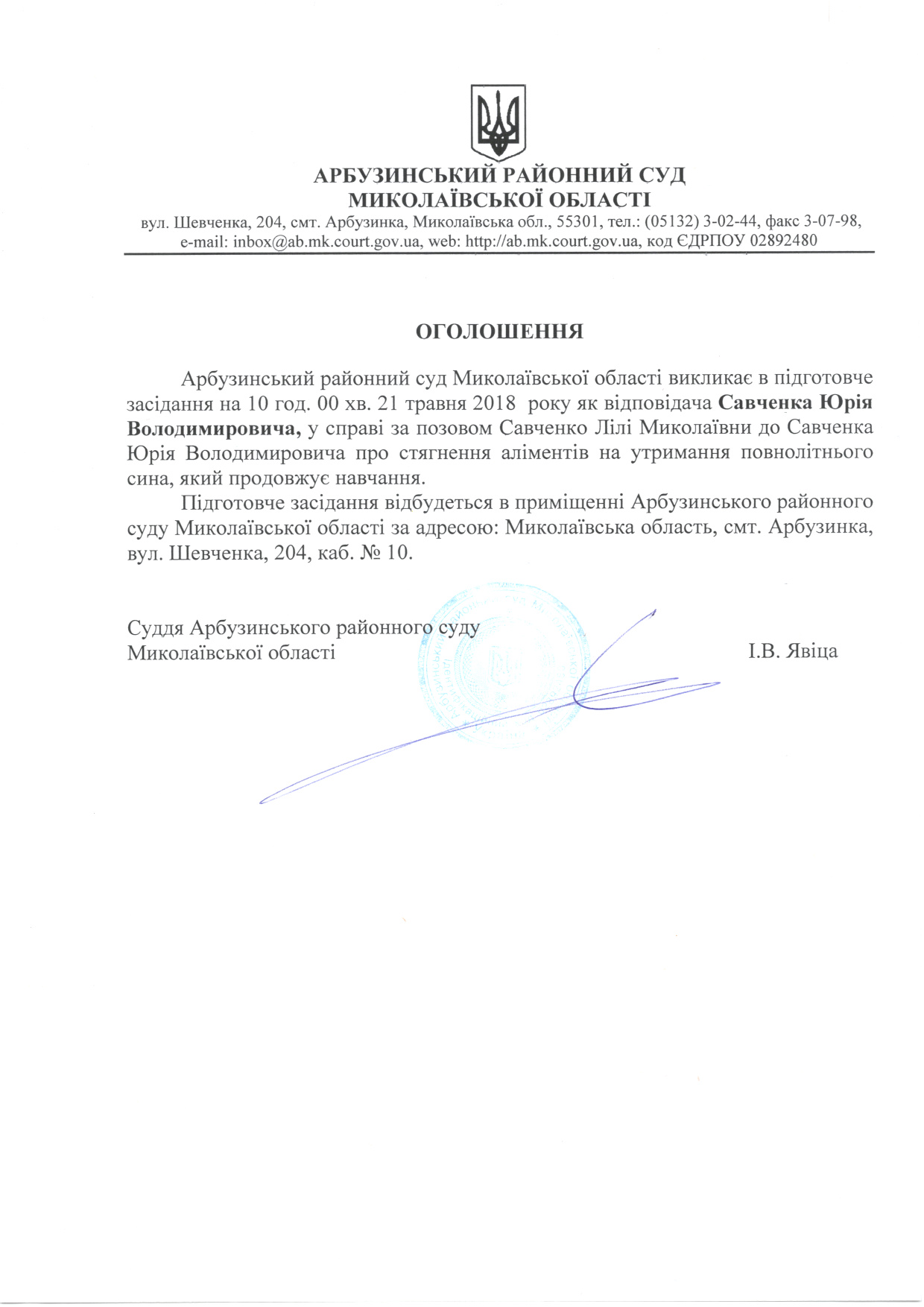 Оголошення про виклик до суду Савченко Юрій Володимирович