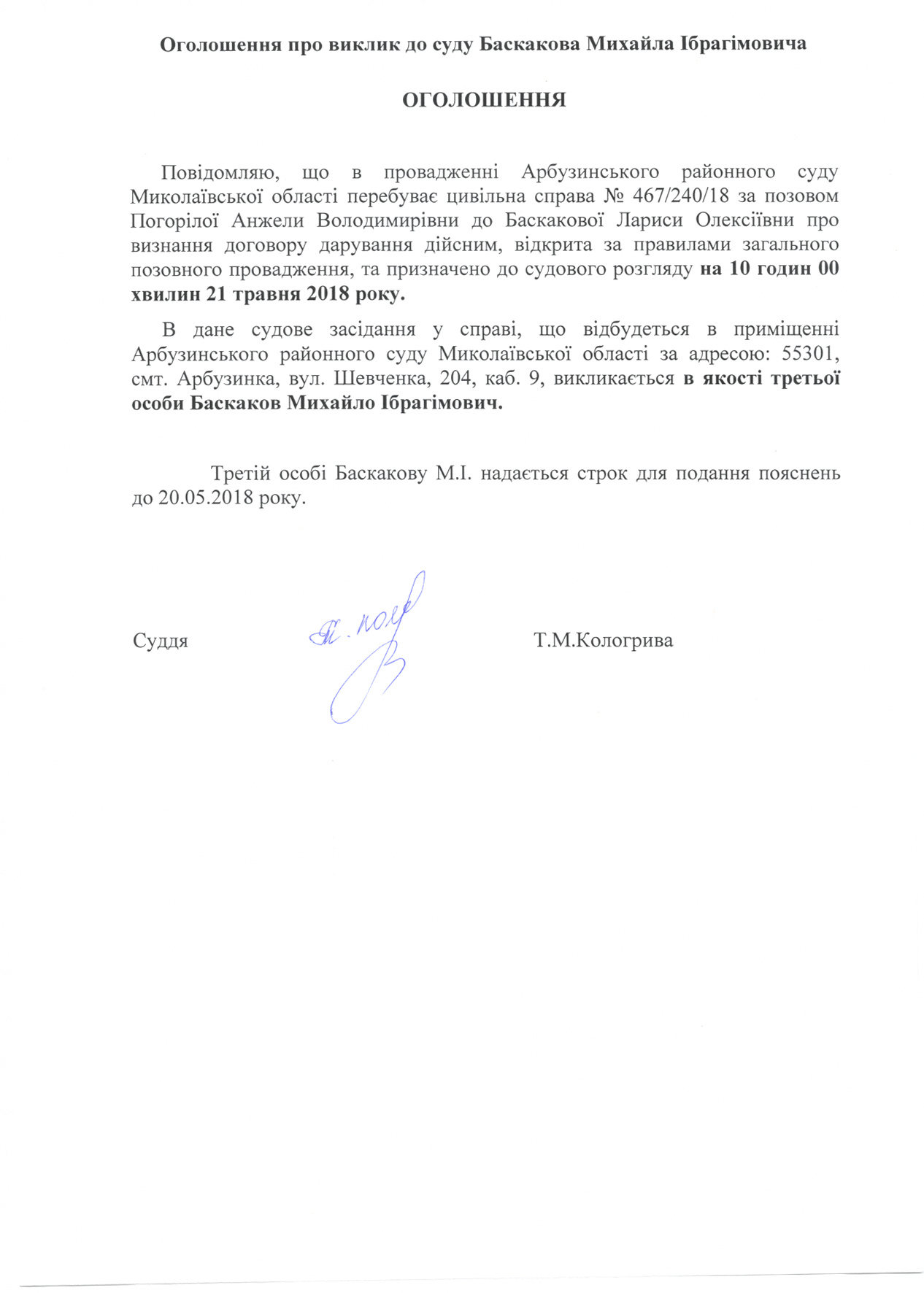 Оголошення про виклик до суду Баскаков Михайло Ібрагімович