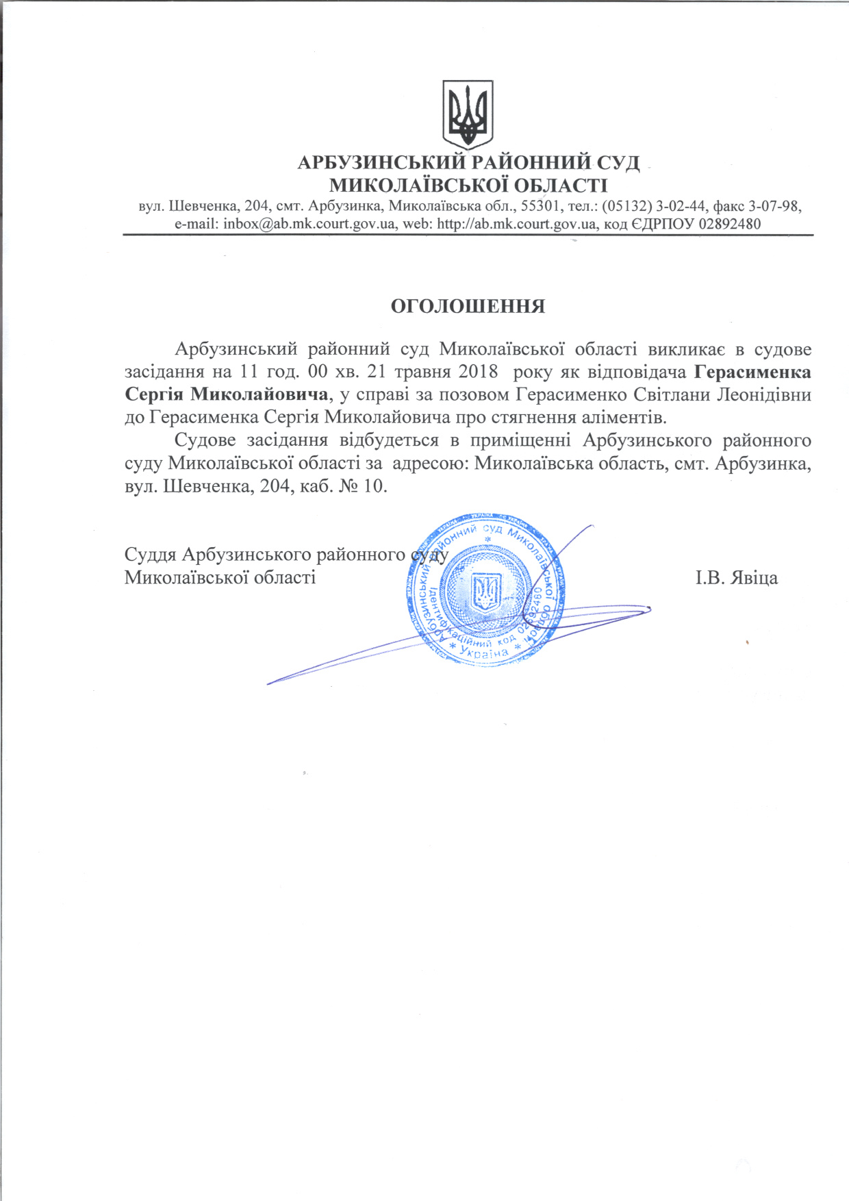 Оголошення про виклик до суду Герасименко Сергій Миколайович