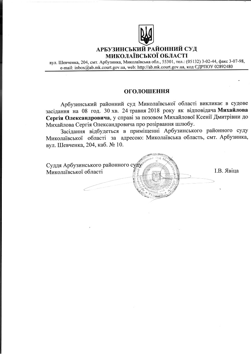 Виклик в судове засідання як відповідача Михайлова Сергія Олександровича