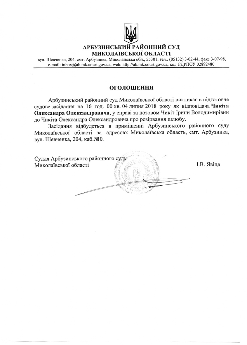 Оголошення про виклик до суду Чикіта Олександра Олександровича