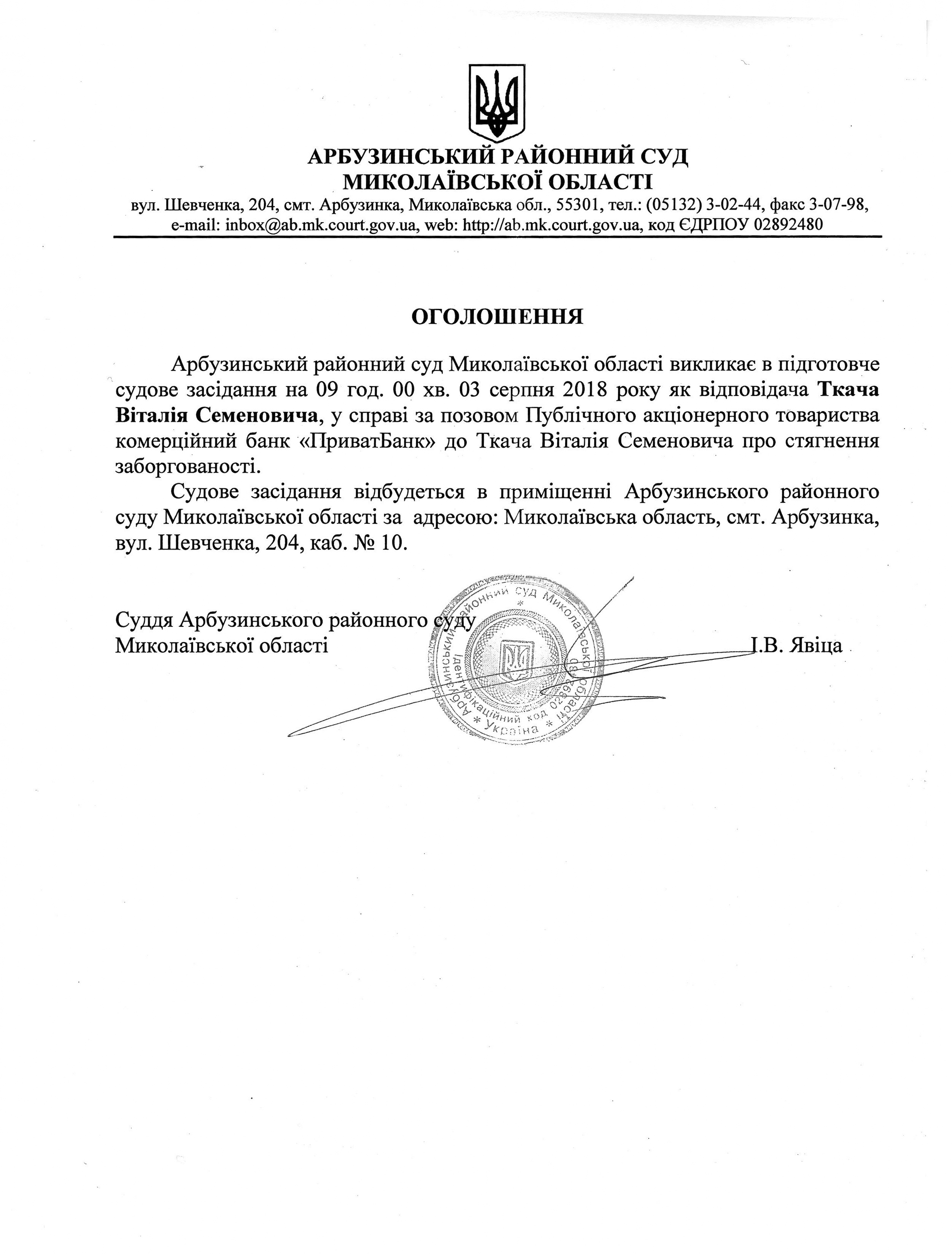 Оголошення про виклик до суду Ткач Віталій Семенович