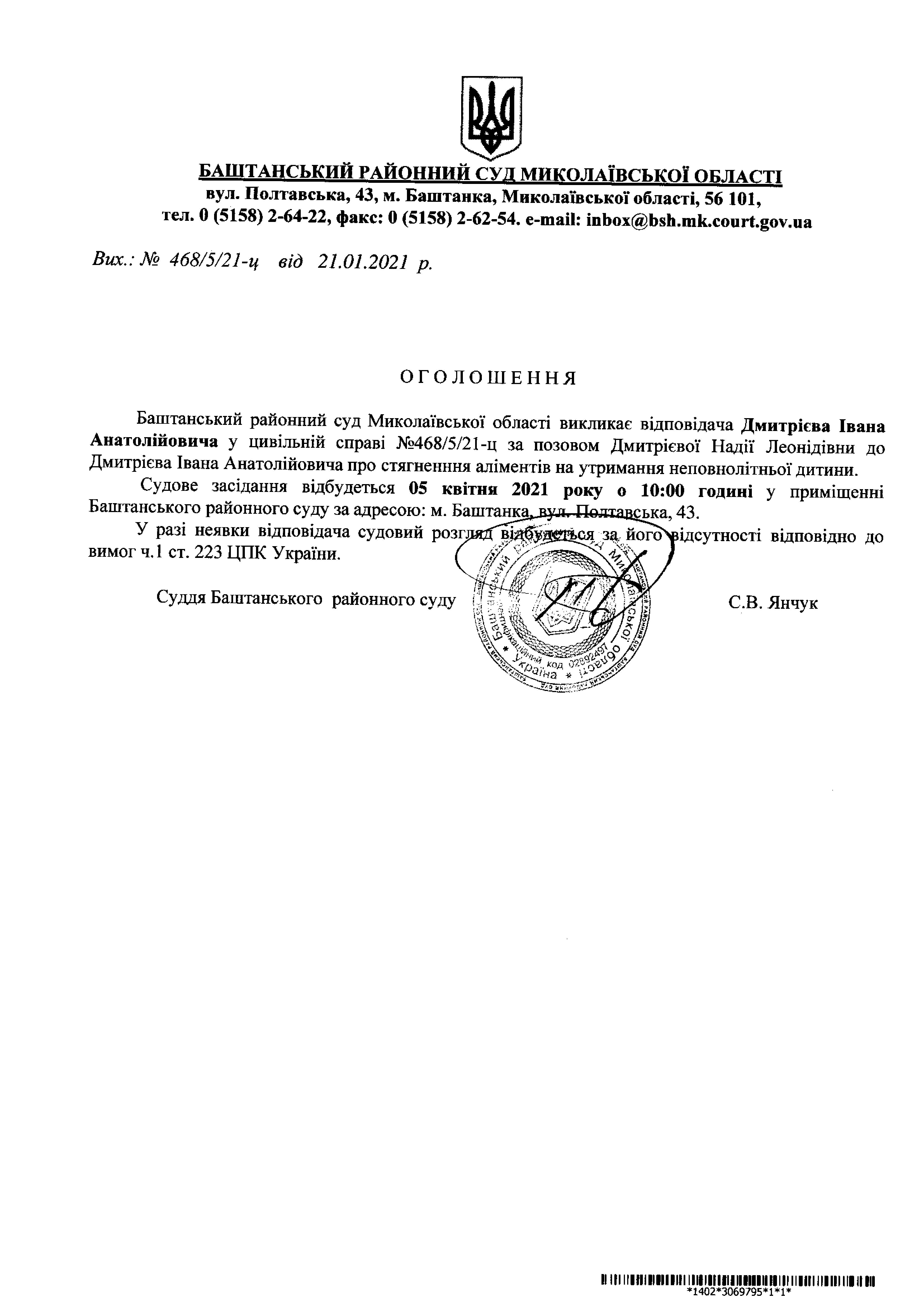 Оголошення про виклик до суду Дмитрієва І.А.