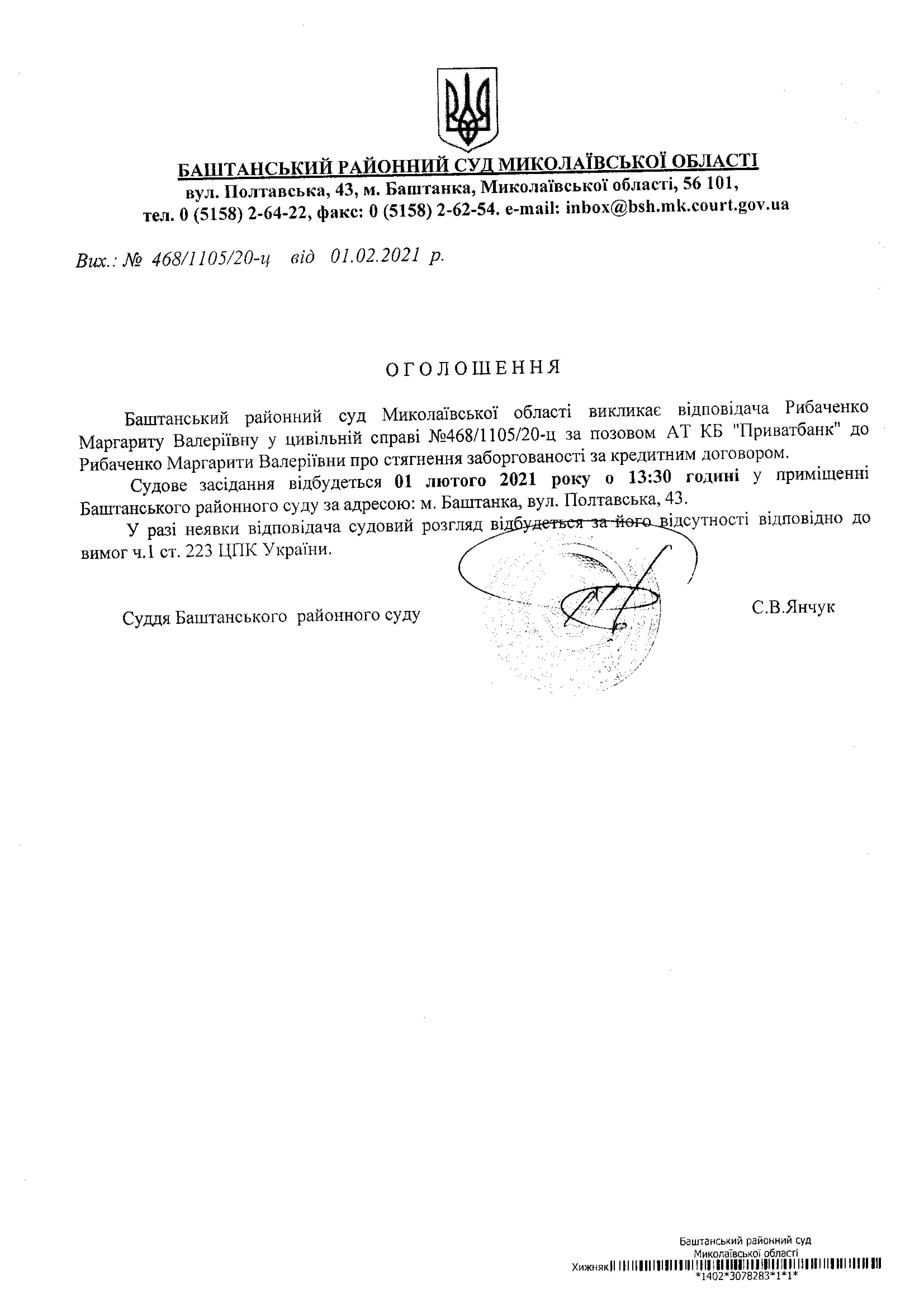 Оголошення про виклик до суду Рибаченко М.В.