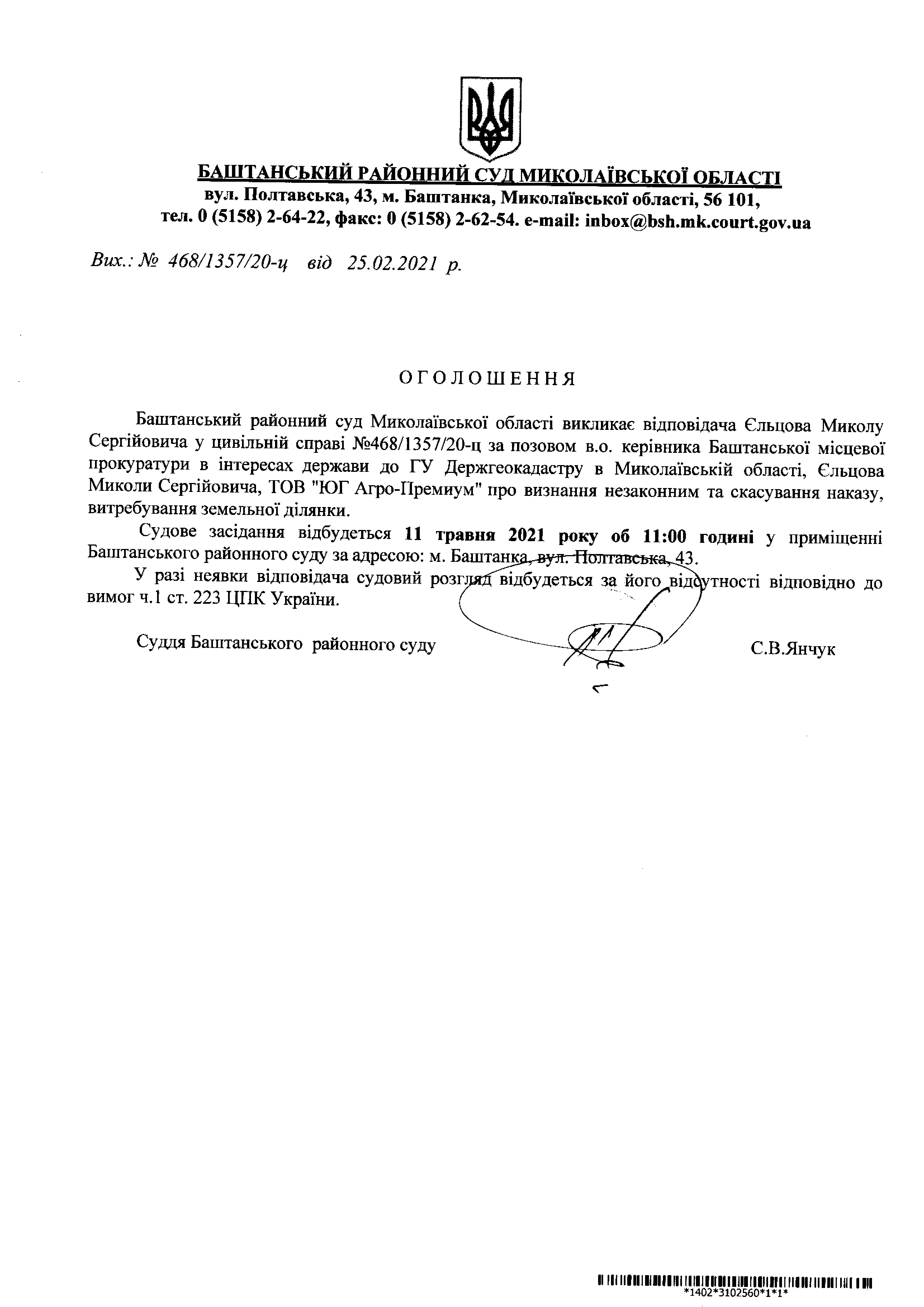 Оголошення про виклик до суду Єльцова Миколу Сергійовича