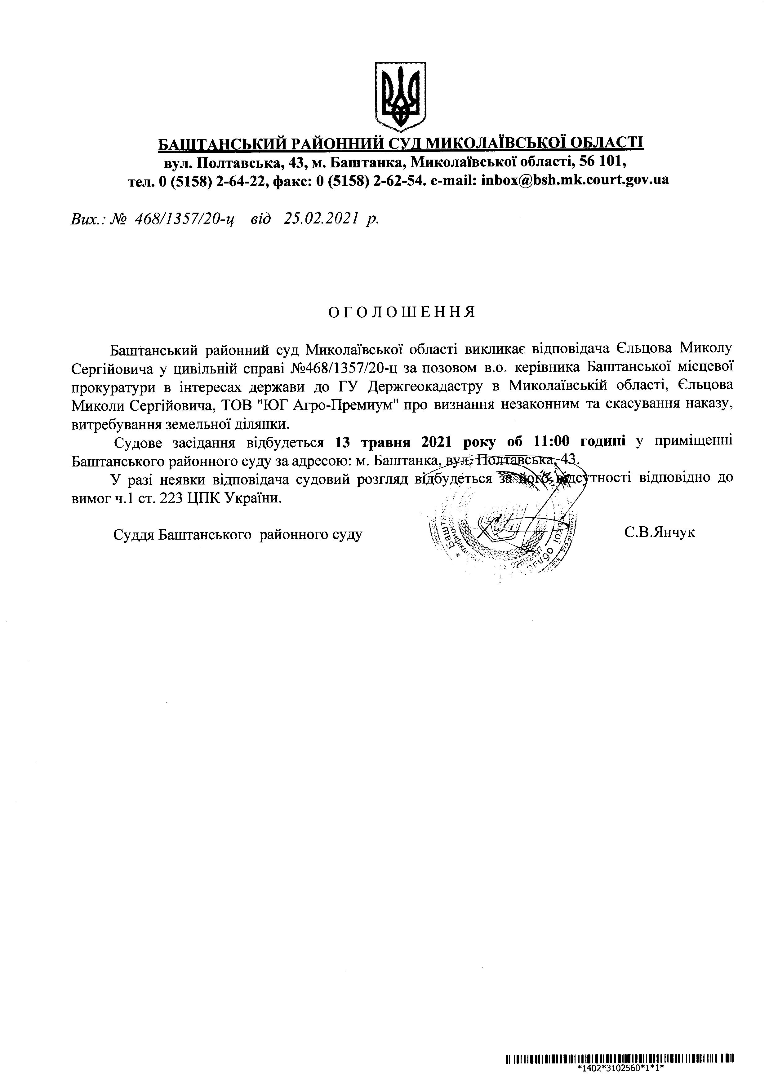 Оголошення про виклик до суду Єльцова Миколу Сергійовича