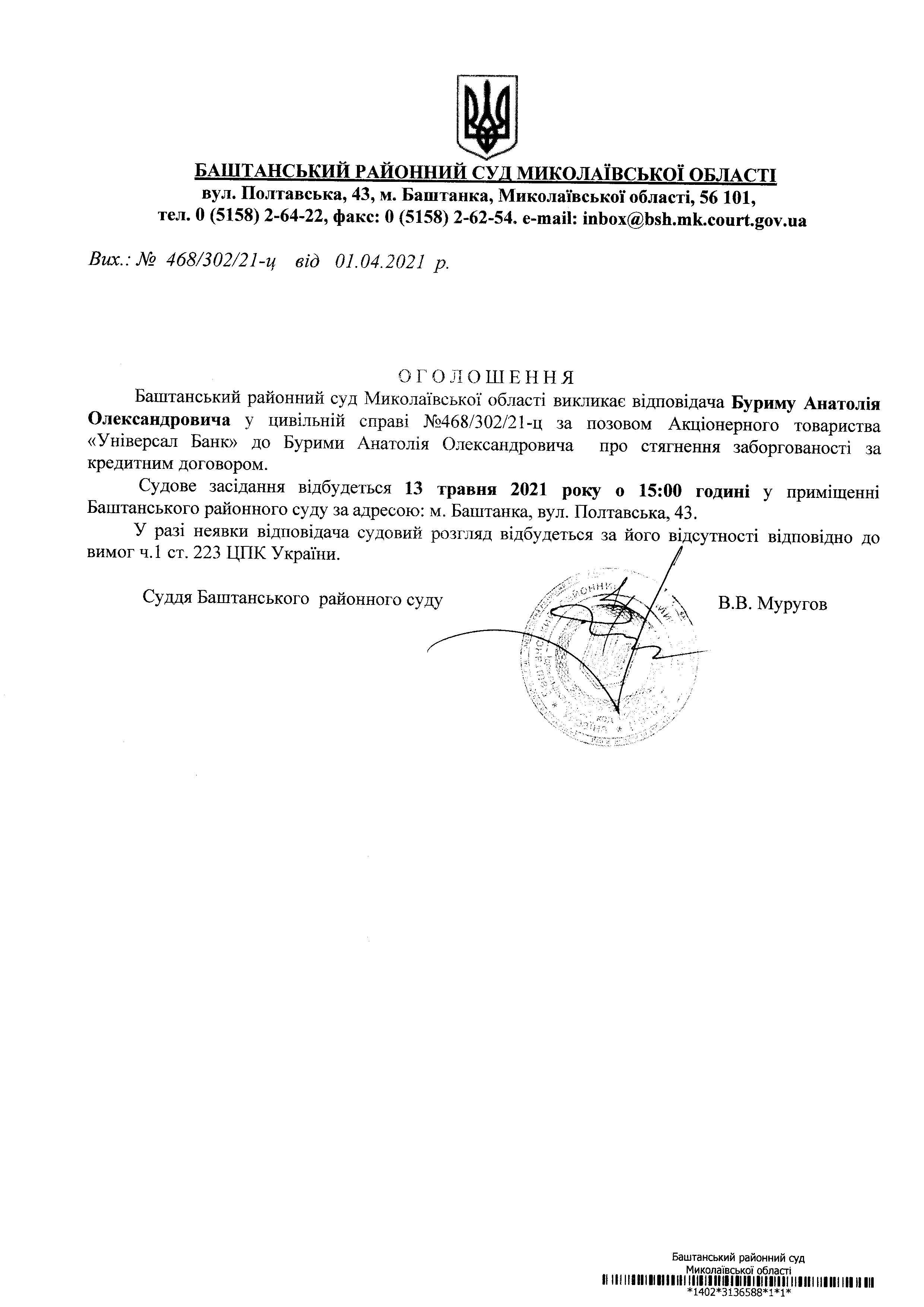 Оголошення про виклик до суду Буриму А.О.