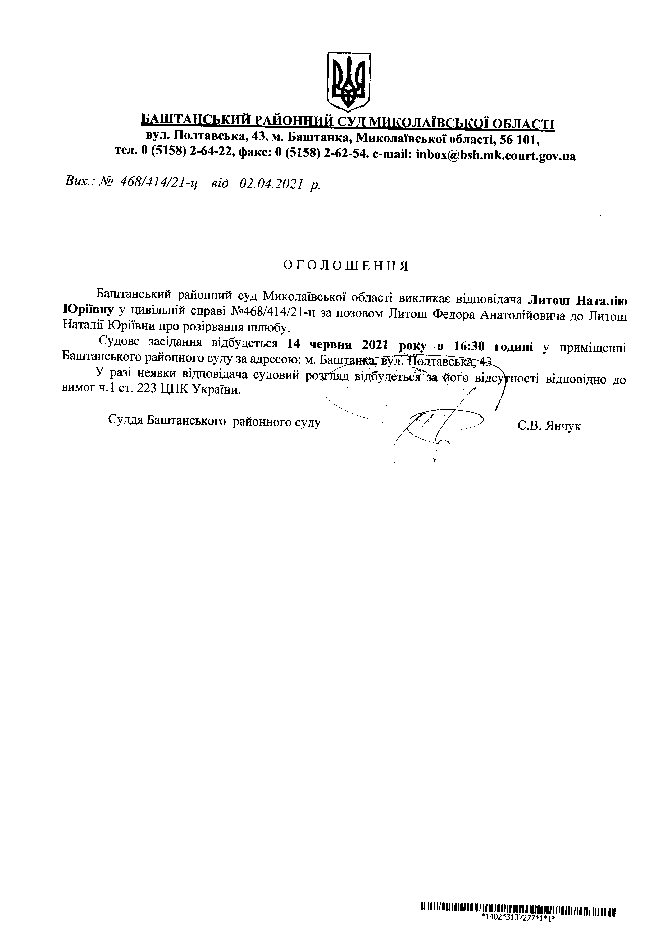 Оголошення про виклик до суду Литош Н.Ю.