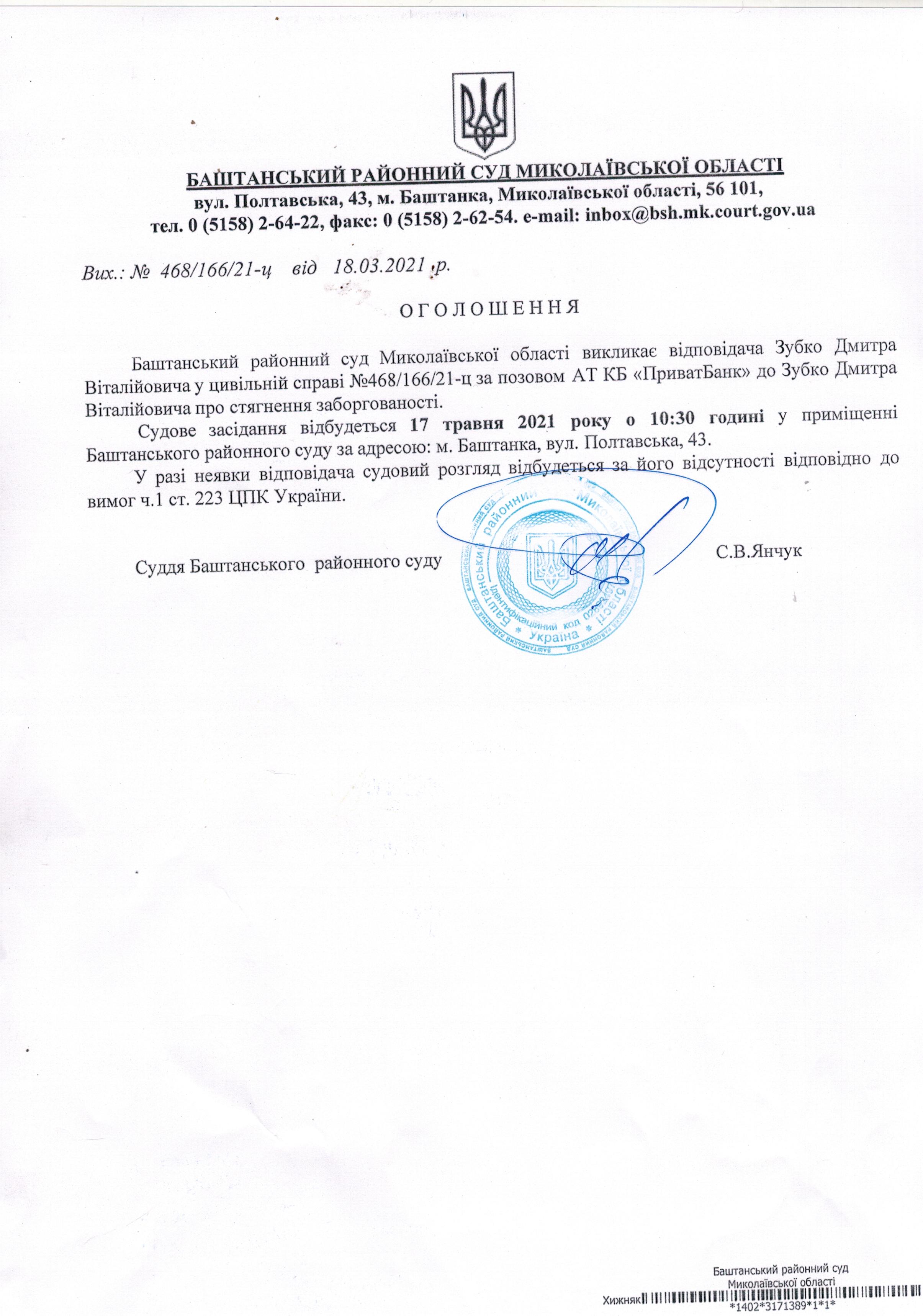 Оголошення про виклик до суду Зубко Д.В.