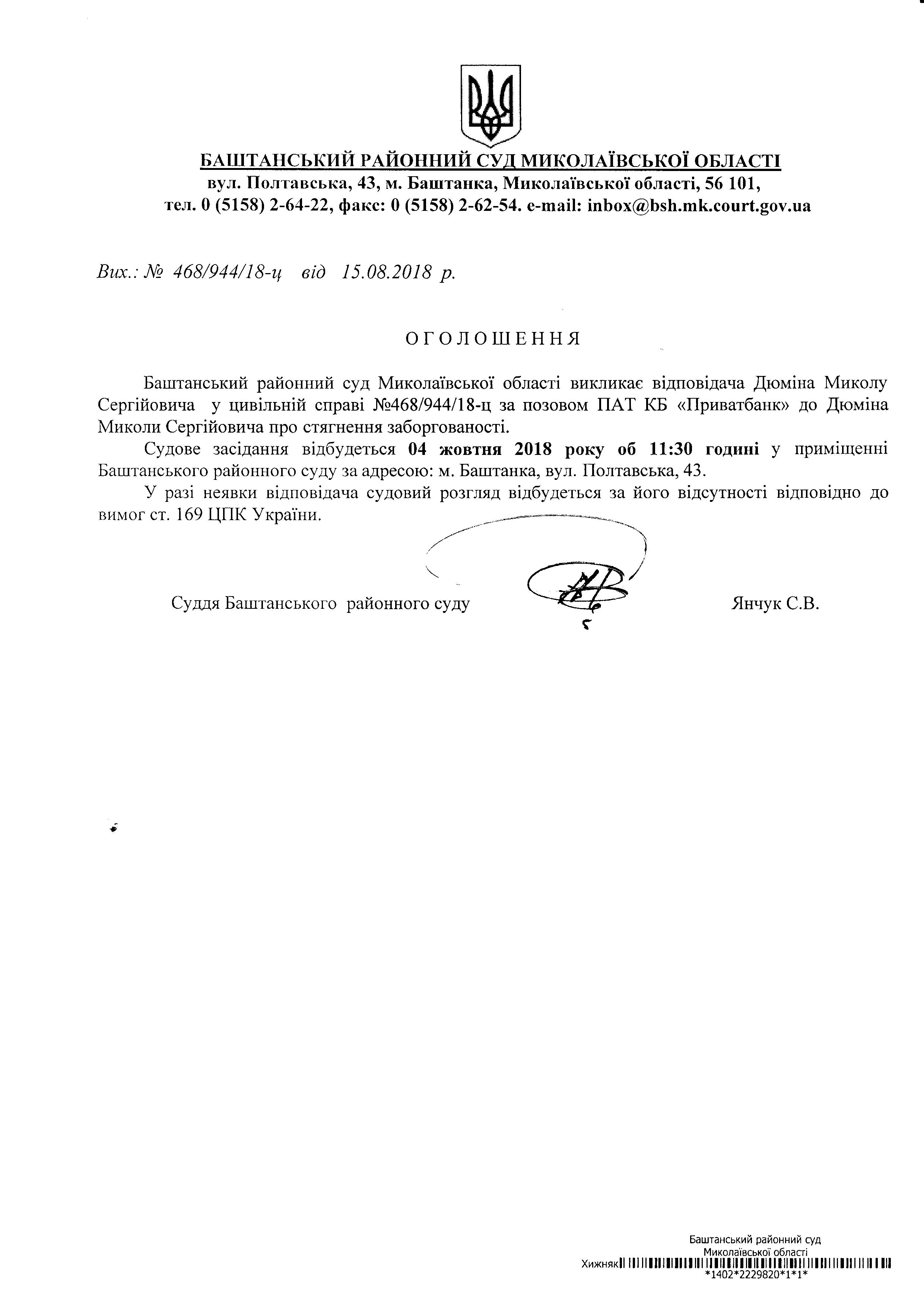 Оголошення про виклик до суду Дюміна М.С.