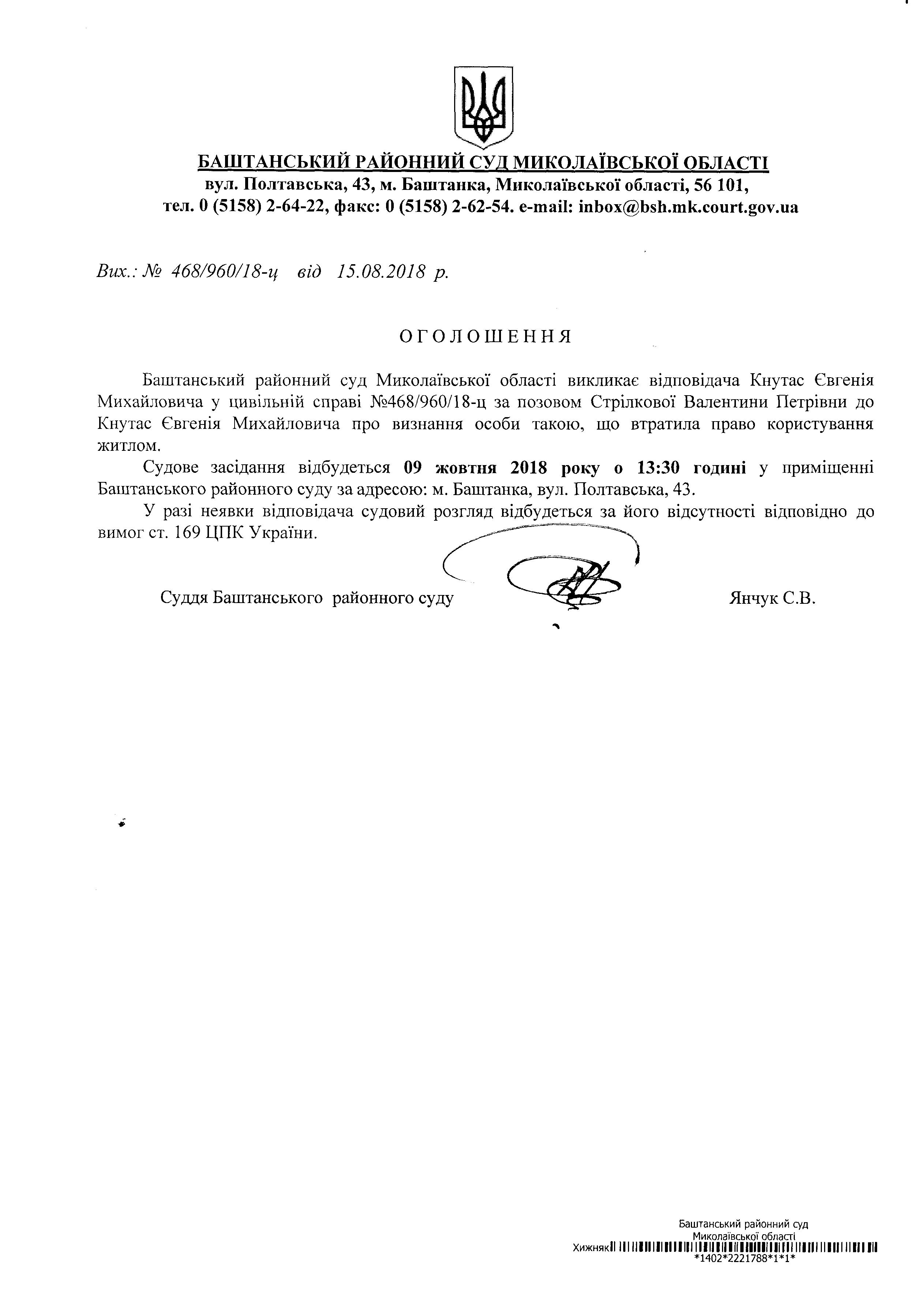 Оголошення про виклик до суду Кнутаса Є.М.