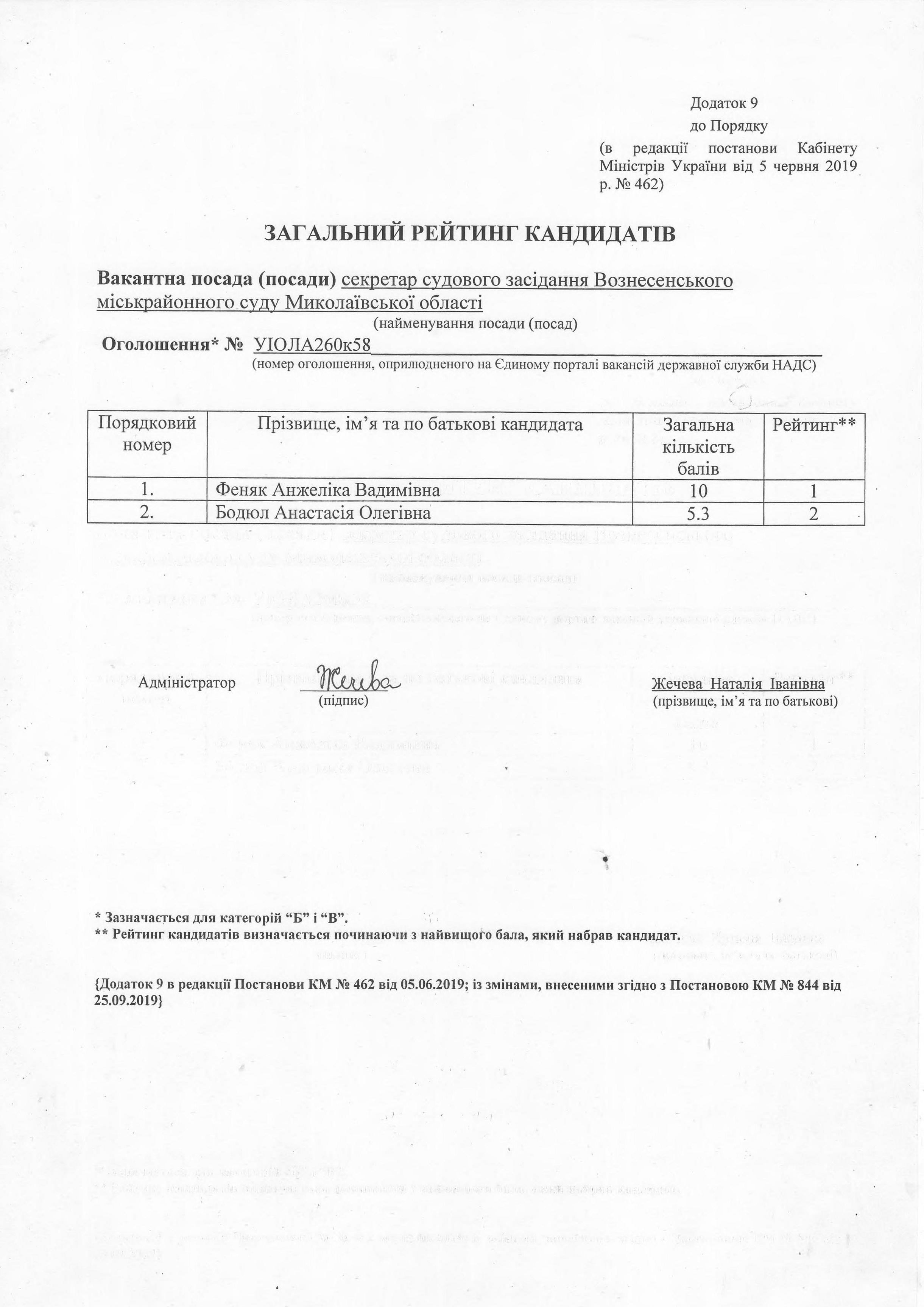 Загальний рейтинг кандидатів на посаду Cекретаря судового засідання Вознесенського міськрайонного суду Миколаївської області