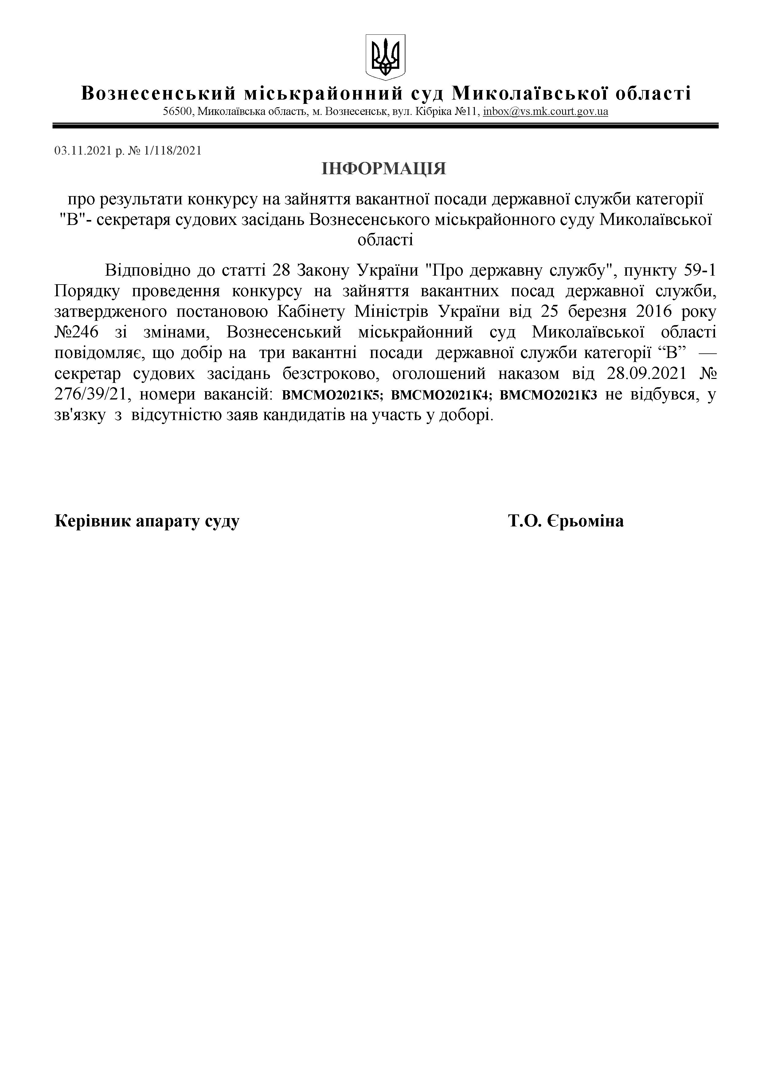 Інформація про результати конкурсу на зайняття вакантної посади державної служби категорії "В"- секретаря судового засідання Вознесенського міськрайонного суду Миколаївської області