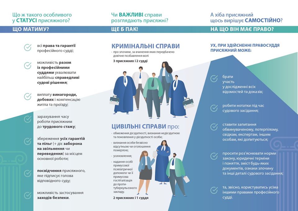 Конституцією України передбачено, що правосуддя здійснюють судді, а у визначених законом випадках правосуддя здійснюється за участю присяжних. Присяжні – це особи, які за їх згодою залучаються до вирішення певної категорії цивільних та кримінальних справ разом із суддею.