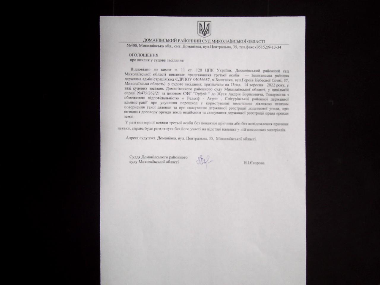 оголошення про виклик до суду представника відповідача ТОВ "Рельєф Агро"