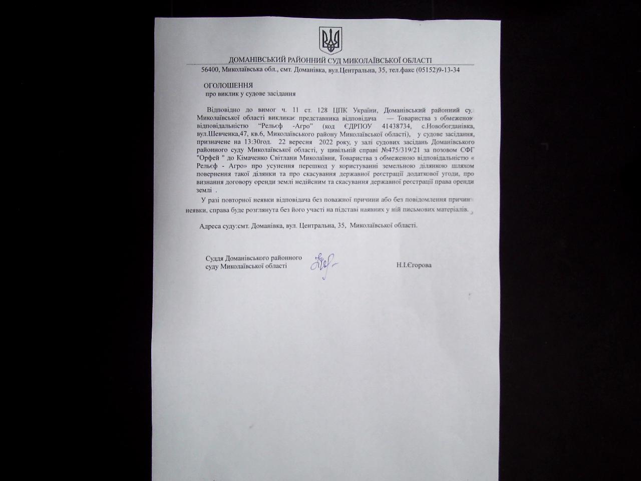 оголошення про виклик до суду представника відповідача ТОВ "Рельєф Агро"