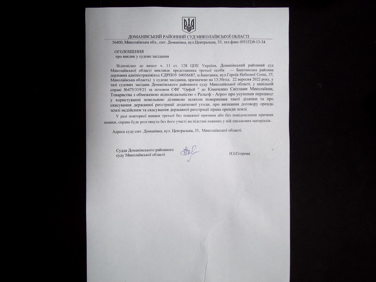оголошення про виклик до суду представника третьої особи Баштанська РДА