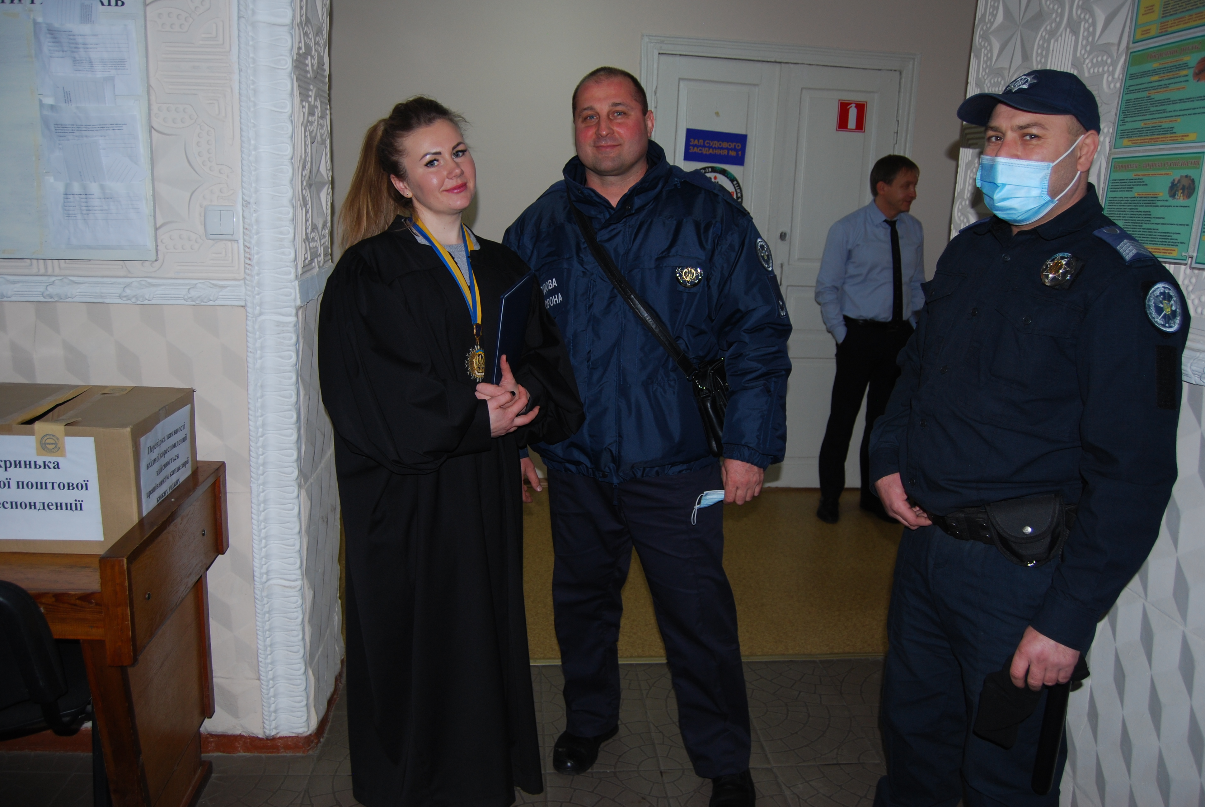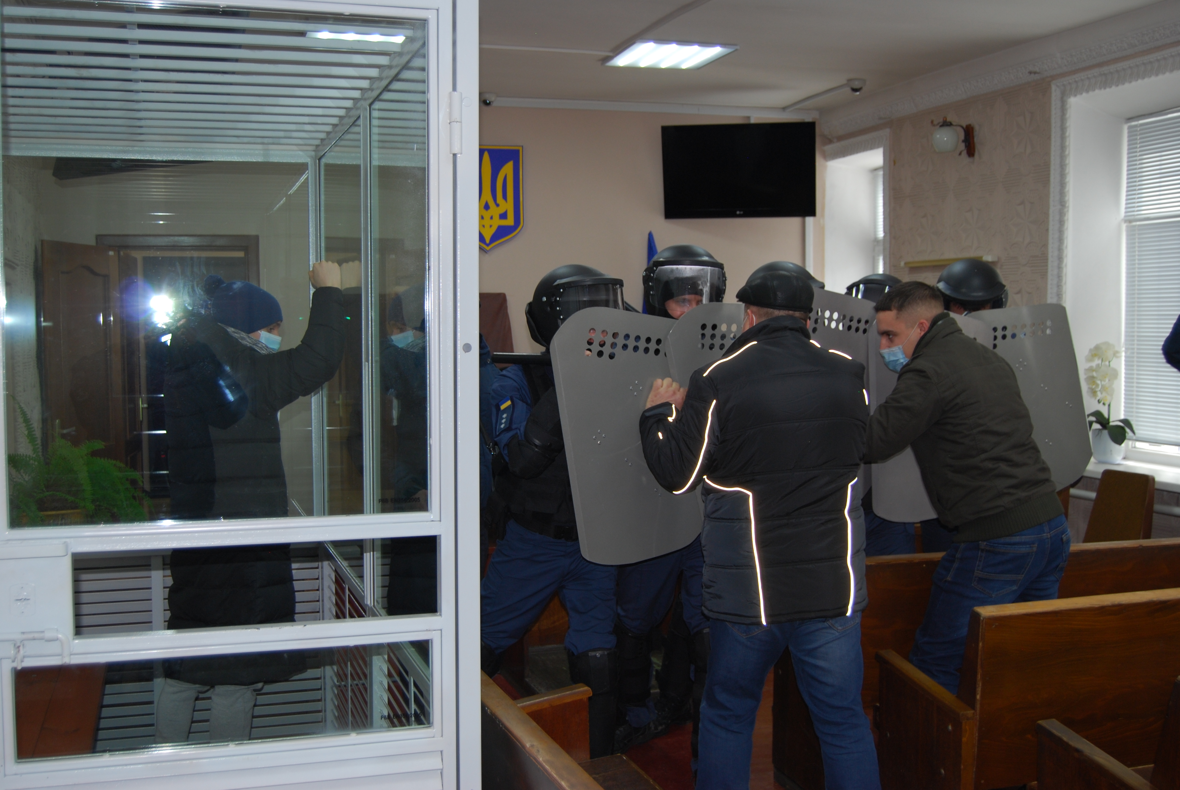 Спеціально екіпіровані представники судової охорони щитами відтіснили присутніх порушників. Командир взводу почав з ними перемови, в ході яких особи, які вчинили заворушення заспокоїлись та по черзі були виведені з будівлі суду.