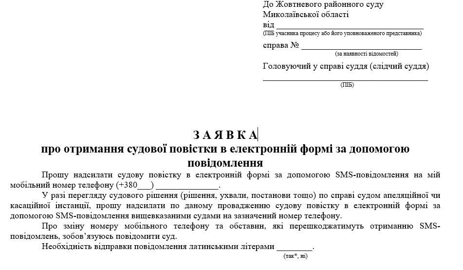 Подання учасниками судового процесу заяви про намір отримувати судовий виклик у вигляді SMS-повідомлення заощадить час, який затрачається для направлення судових викликів поштою, та забезпечить своєчасне інформування щодо часу та місця розгляду справи незалежно від тимчасової відсутності за місцем проживання.