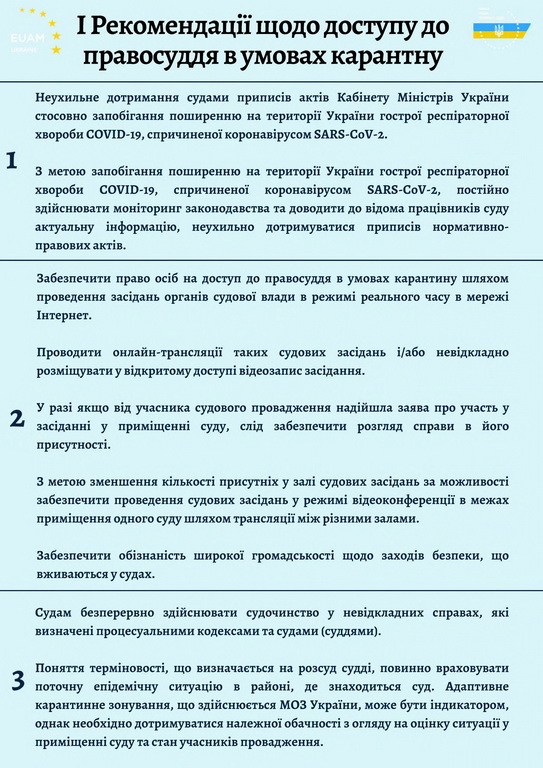 Вища рада правосуддя спільно із Консультативною місією Європейського Союзу з реформування сектору цивільної безпеки України (КМЄС в Україні) розробила уніфіковані рекомендації для всіх судів України щодо безпечної роботи в умовах карантину. Відповідне рішення (https://hcj.gov.ua/doc/doc/6516) ухвалено ВРП на засіданні 1 квітня 2021 року.