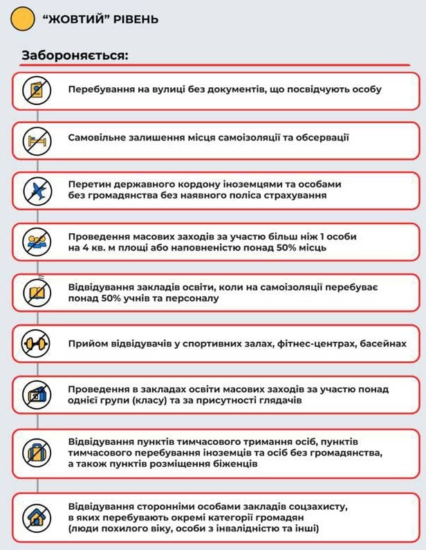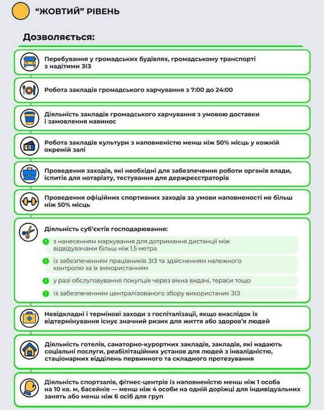 Дозволи та заборони, які передбачені в умовах «жовтого» рівня епідемічної небезпеки: