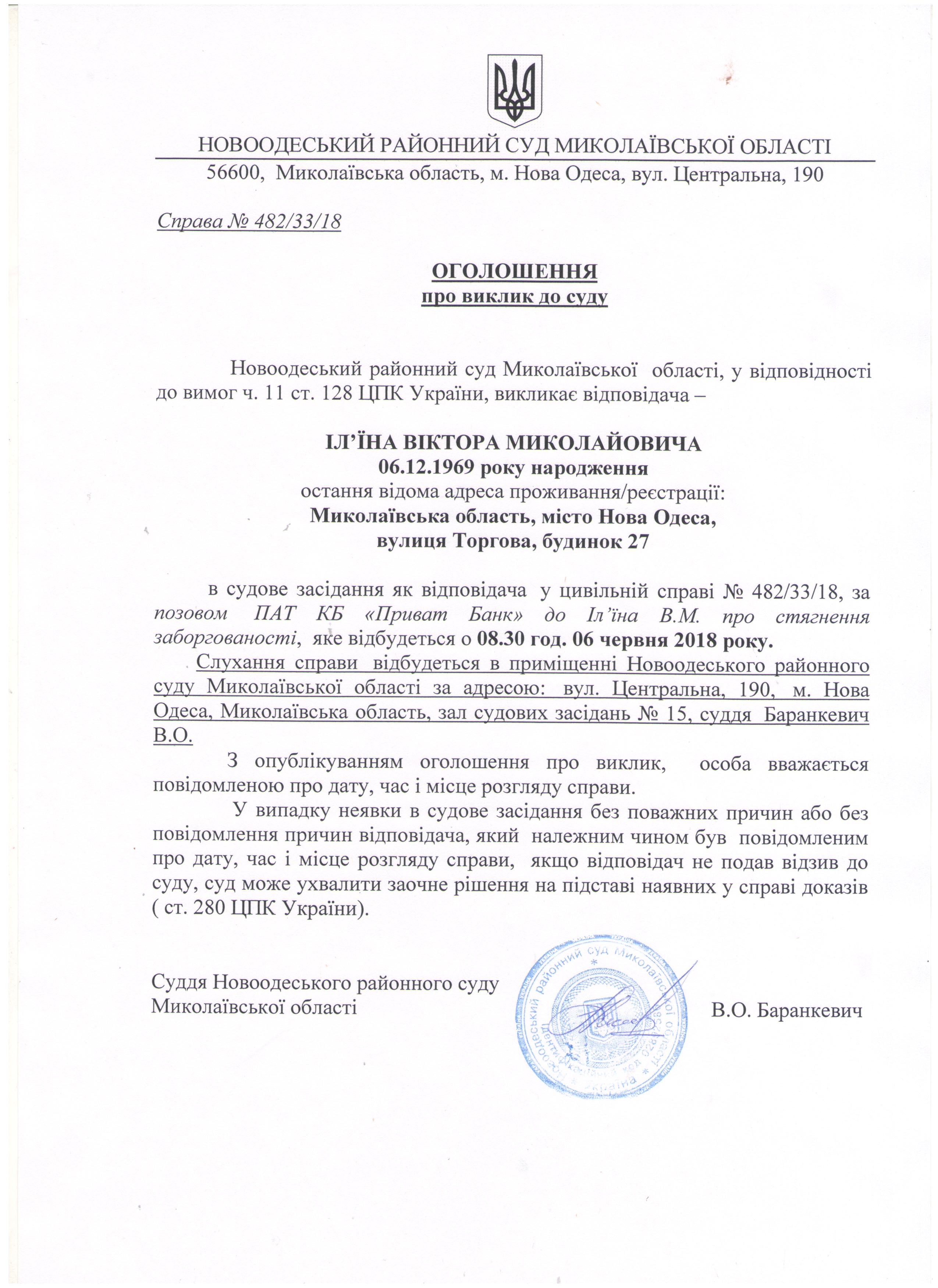 Оголошення про виклик до суду Іл’їна Віктора Миколайовича по справі 482/33/18