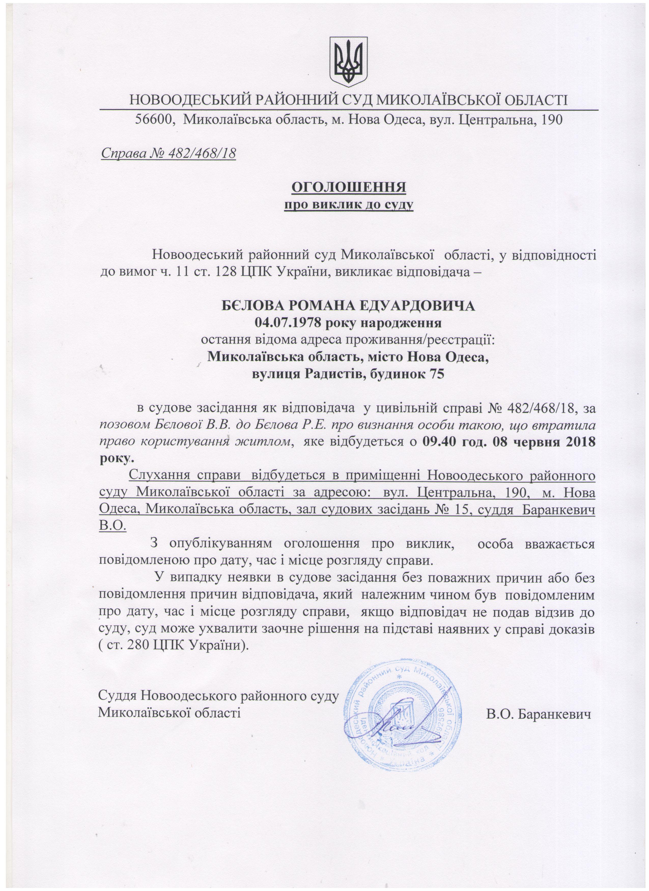 Оголошення про виклик до суду Бєлова Романа Едуардовича по справі 482/468/18